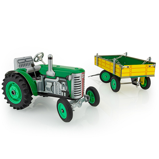 Traktor Zetor s valníkem zelený od značky Kovap. Pohyb traktoru zajišťuje unikátní pérový strojek natahovaný klíčkem. Funkční převodovka má tři rychlosti dopředu a zpátečku. Traktor lze volantem skutečně řídit a navíc ho i zabrzdit ruční brzdou. Měřítko 1:25. Rozměry balení 30 x 9 x 9 cm. Vhodné pro děti od 3 let.
