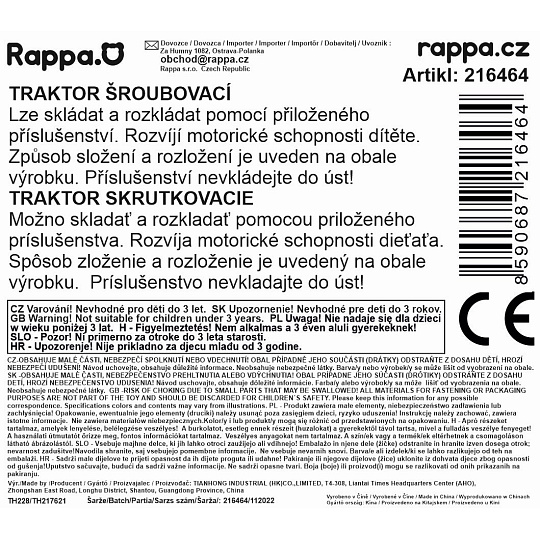 Moderní plastový farmářský traktor s vlečkou a balíky slámy, hračka z kolekce Moje malá farma. Vlečka se dá jednoduše odpojit a balíky sundat. Traktor jezdí na volný chod a jeho délka je 10 cm. Přívěs je v délce 12 cm, celková délka včetně přívěsu je 25 cm. Zmáčknutím tlačítka na traktoru vydává reálné zvuky spolu se světelným efektem. Tr