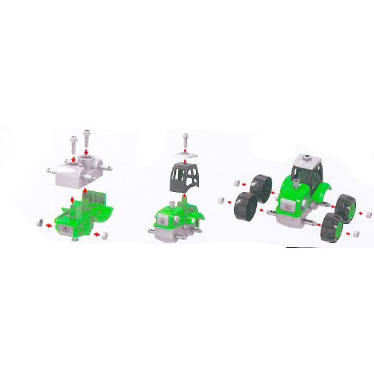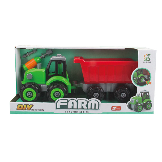 Zelený šroubovací traktor s červenou vlečkou. Pomocí šroubováku, který najdeš v balení, můžeš traktor snadno rozložit a sestavit si ho znovu. Rozvíjí kreativitu. Velikost traktoru s vlečkou je 32 cm.
