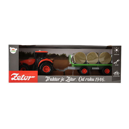 Traktor Zetor s vlekem a balíky plast 36cm na setrvačník na bat. se světlem se zvukem v krab. 39x13