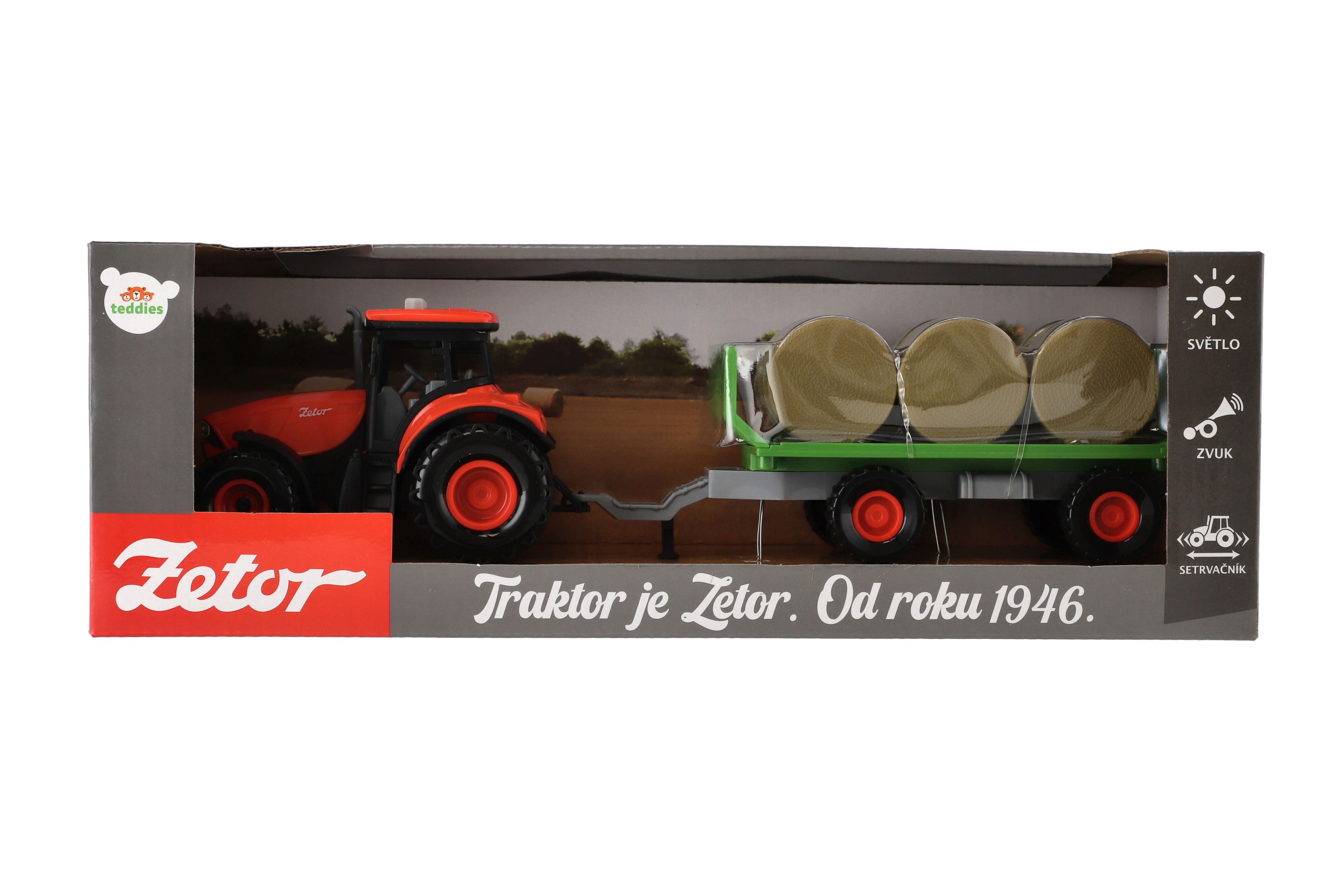 Traktor Zetor s vlekem a balíky plast 36cm na setrvačník na bat. se světlem se zvukem v krab. 39x13