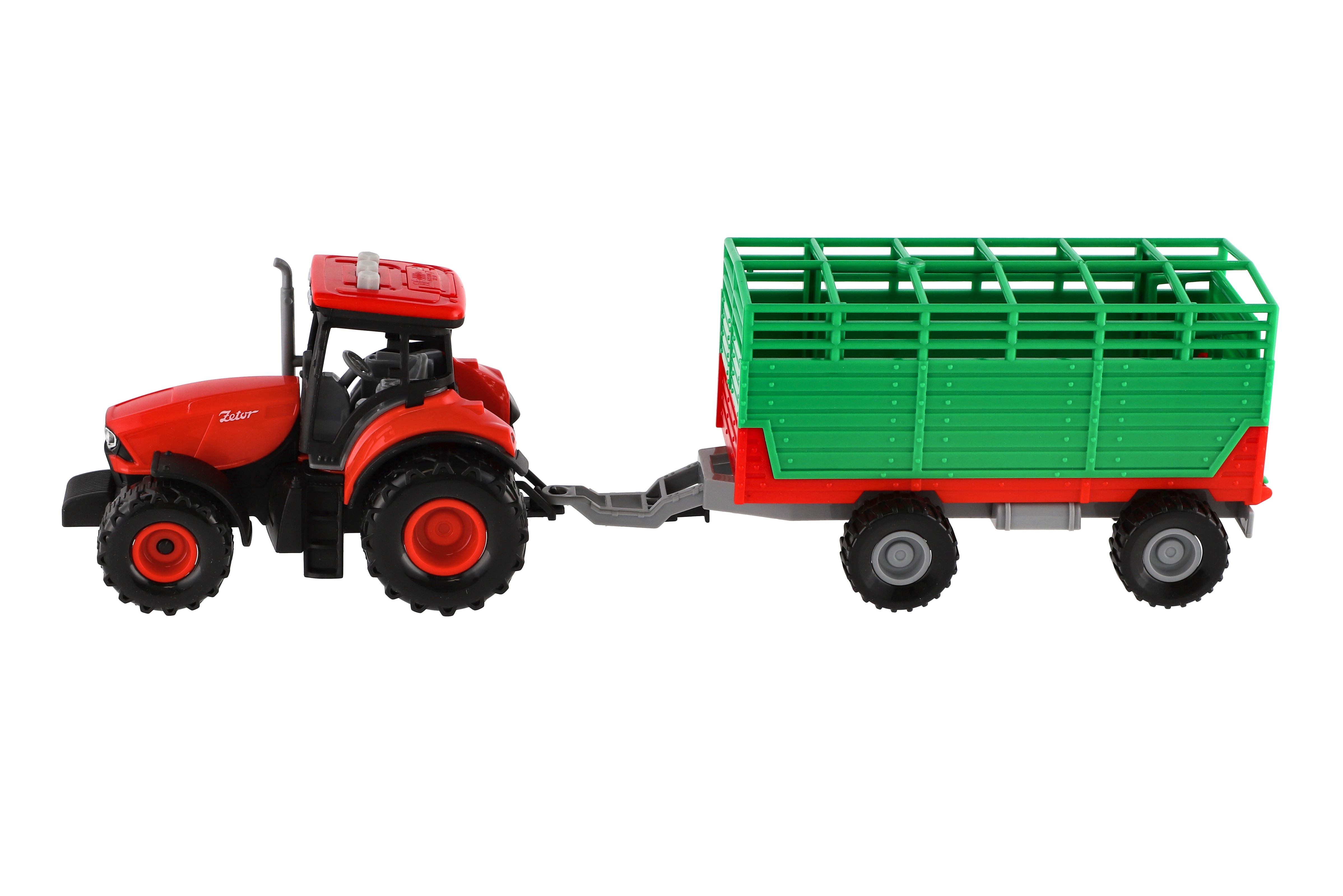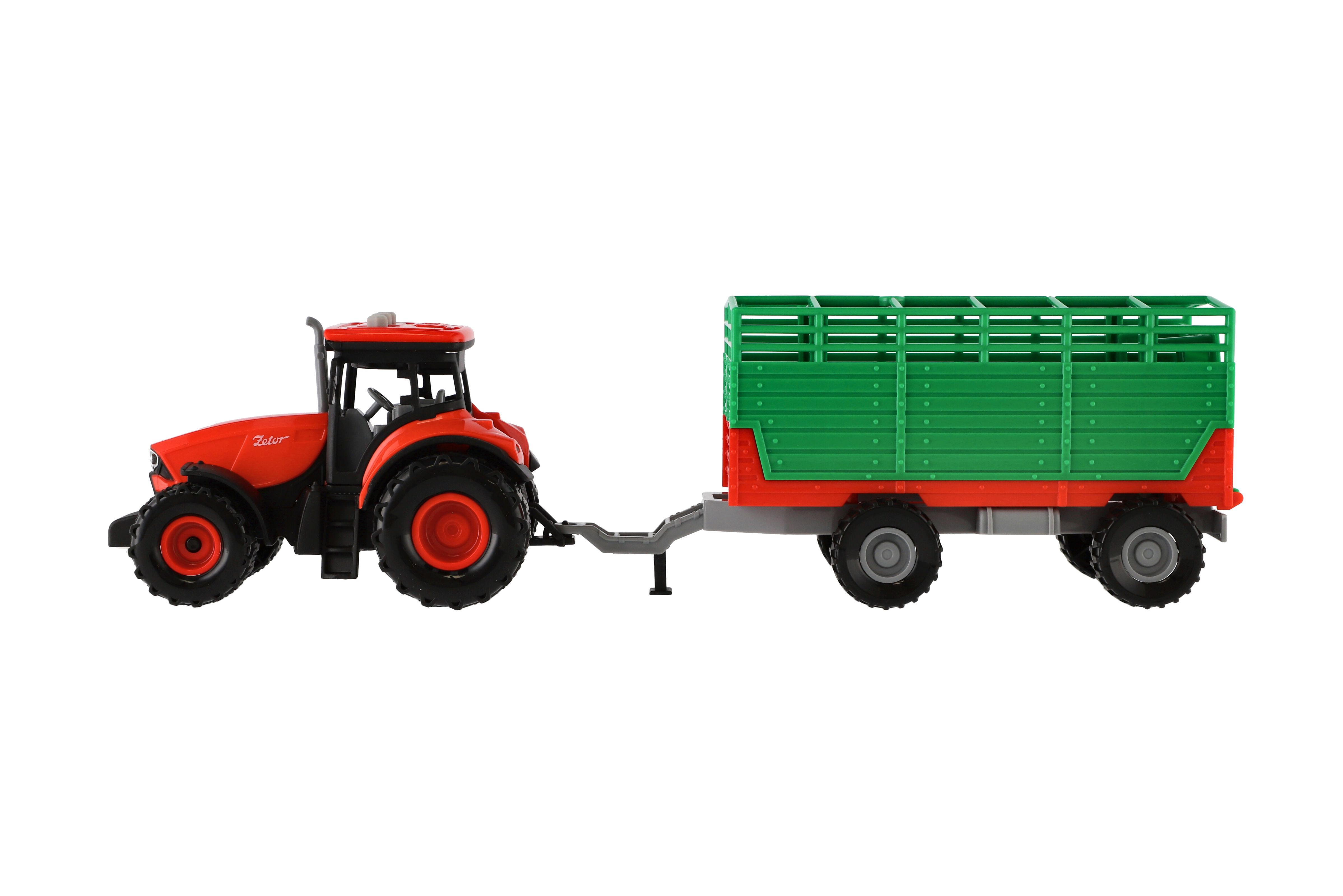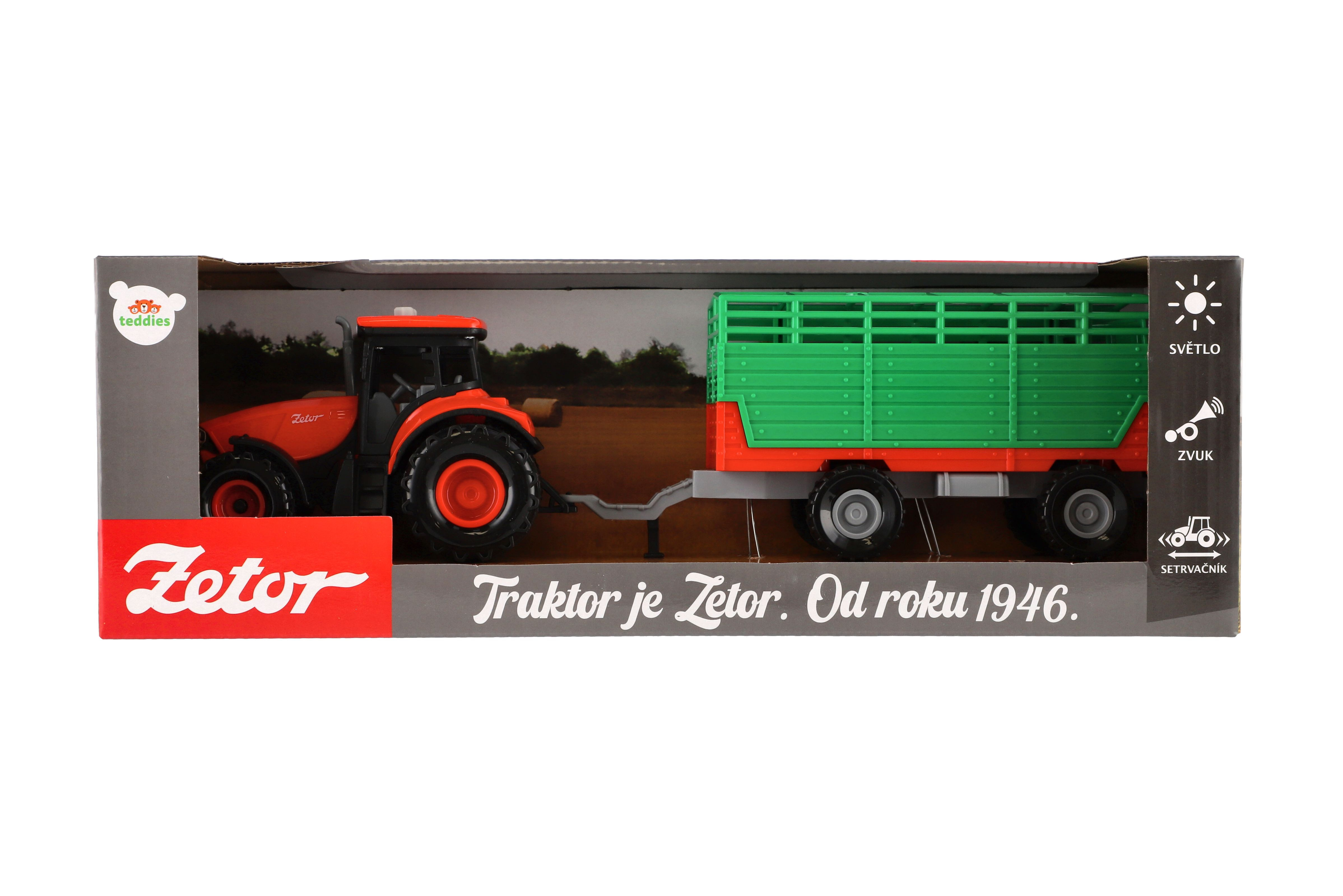 Traktor Zetor s vlekem plast 36cm na setrvačník na bat. se světlem se zvukem v krabici 39x13x13cm