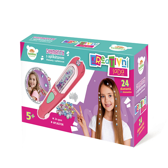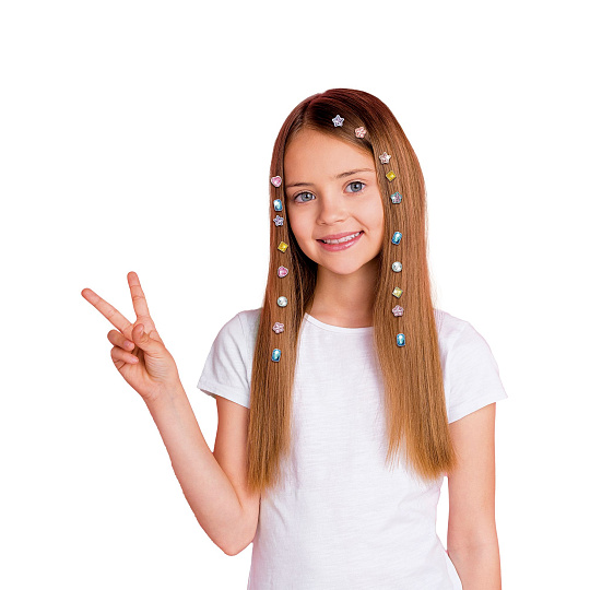 Kreativní sada 24 diamantů a 24 spon s aplikátorem. Diamant vložte do vrchní části aplikátoru. Do spodní části vložte přezku. Do přezky ve spodní části vložte slabý pramen vlasů a umístěte ho tam, kde chcete diamant připevnit. Zmáčkněte aplikátor, abyste diamant na vlasech zafixovali přezkou. Drahokam zůstane na pramenu vlasů připevněný. Rozměry balení 22 x 12 x 6 cm Vhodné pro děti od 5 let