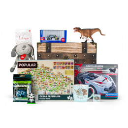 Truhla obsahuje celé spektrum zábavy pro kluky: montování, stavění, hru s vláčky, dobývání dinosaura i plyšové mazlení.