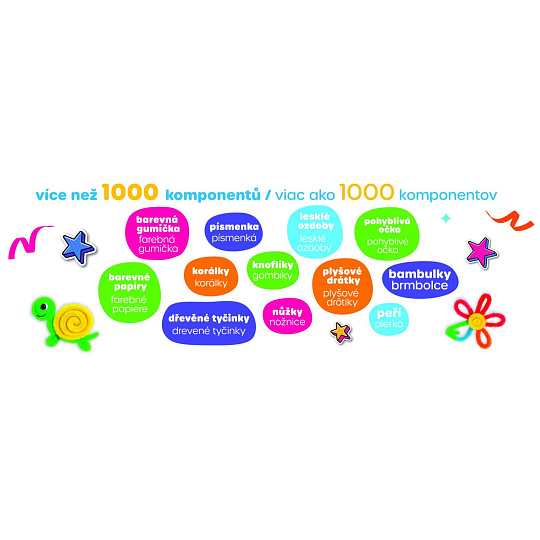 Více než 1000 různorodých komponentů pro nekonečné hodiny zábavného tvoření. Vše je uloženo v praktickém uzavíratelném plastovém boxu s víkem a uchem, takže se nic neztratí a snadno se uklízí i přenáší.