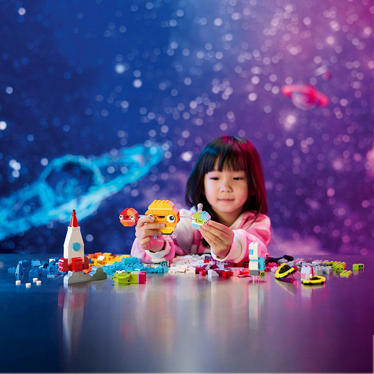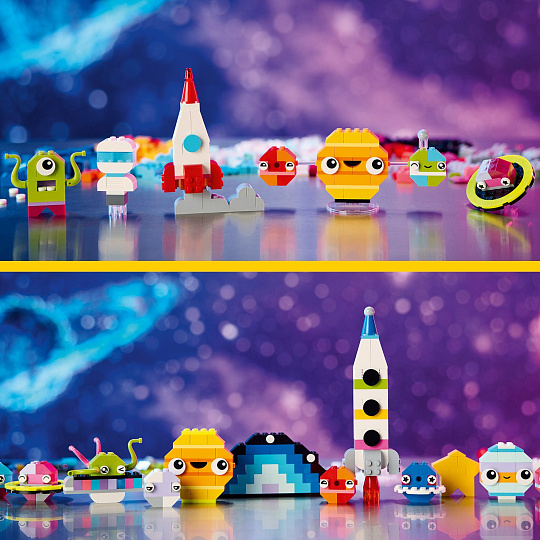 Z barevných kostek mohou děti poskládat vesmírnou raketu, mimozemšťana, astronauta a miniaturní sluneční soustavu včetně Marsu, Země, Slunce a Saturnu s jeho proslulými prstenci. Vesmírné modely mohou vylepšit použitím odlišných barev, tvarů, očí, výrazů a stojánku, díky němuž lze model otáčet. Součástí jsou dokonce i kostky svítící ve tmě, aby výtvory byly vidět i v noci. Díky našim alternativním návodům na stavění si malí stavitelé užijí svou vesmírnou kreativitu a postaví například sluneční soustavu se všemi 8 planetami. V aplikaci LEGO Builder najdete digitální návod a funkce.