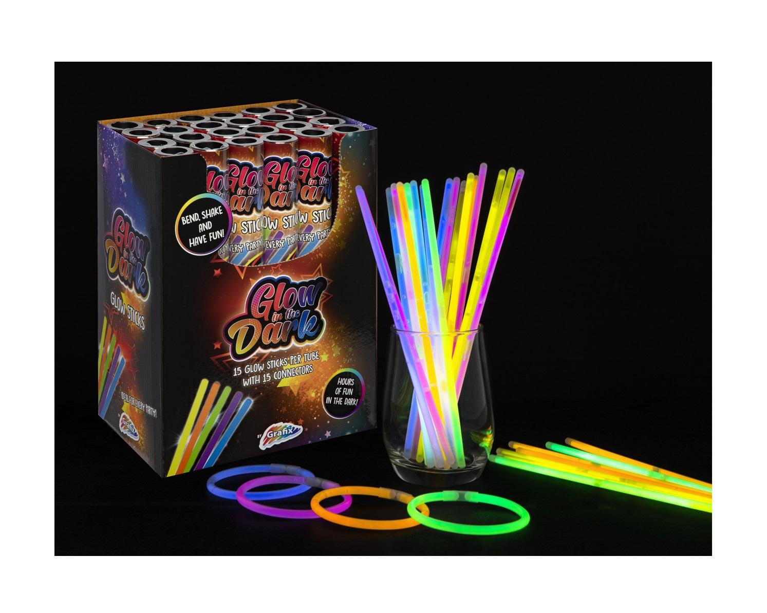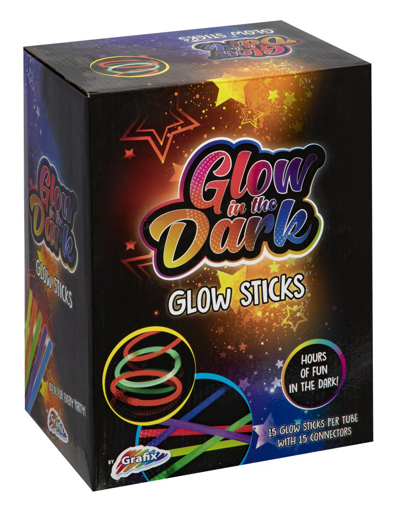 Sada 15 ks svítících tyčinek, baleno v tubě, součástí balení je i 15 kusů spojovačů - k vytvoření svítících náramků. Tyčinku ohněte po celé délce (neohýbejte příliš silně), aby zářila. Po pár minutách se zcela rozsvítí. Ohni, zatřepej a užívej si zábavu.