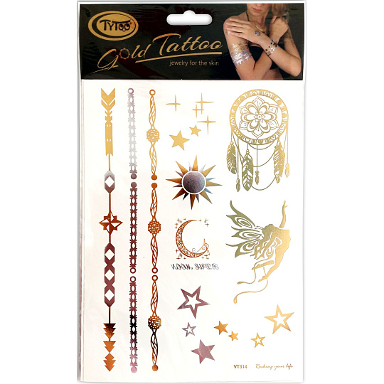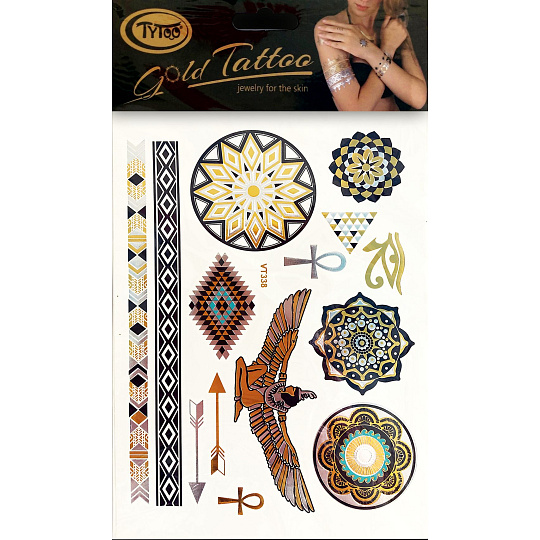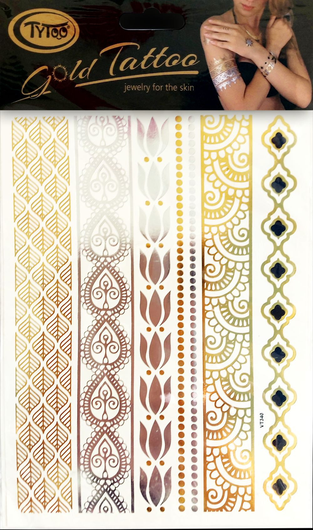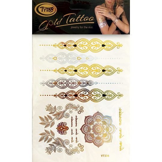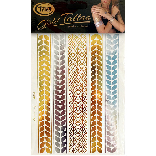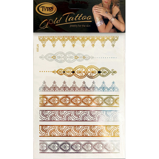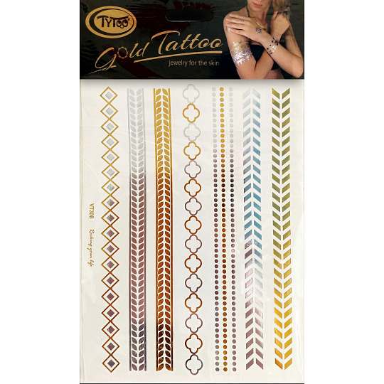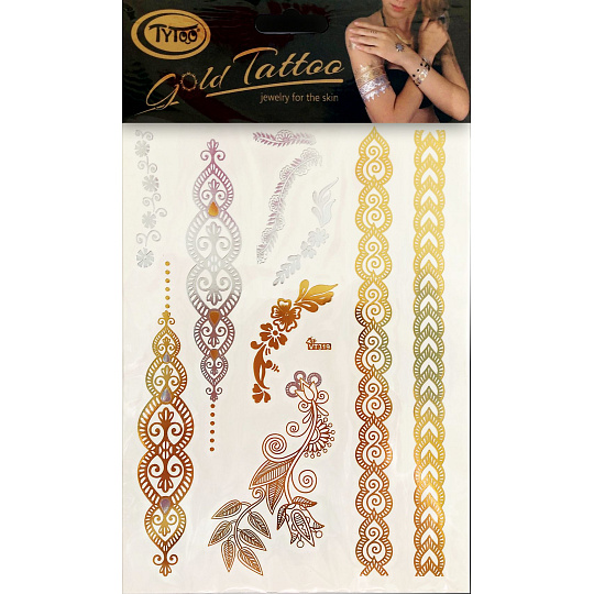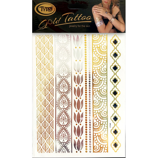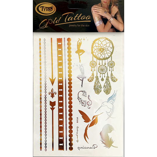 Zlaté tetování je klenot vaší pokožky. Tetovací náramky můžete použít na zápěstí, paži či okolo kotníku. Vytvořte speciální zlaté tetování během několika sekund! Trvanlivost: 2-7 dní v závislosti na typu pleti a použití! Tetování je odolné vůči vodě, dá se však lehce odstranit alkoholem nebo dětským olejíčkem. Velikost archu je 21x15 cm. Vhodné od 3 let.