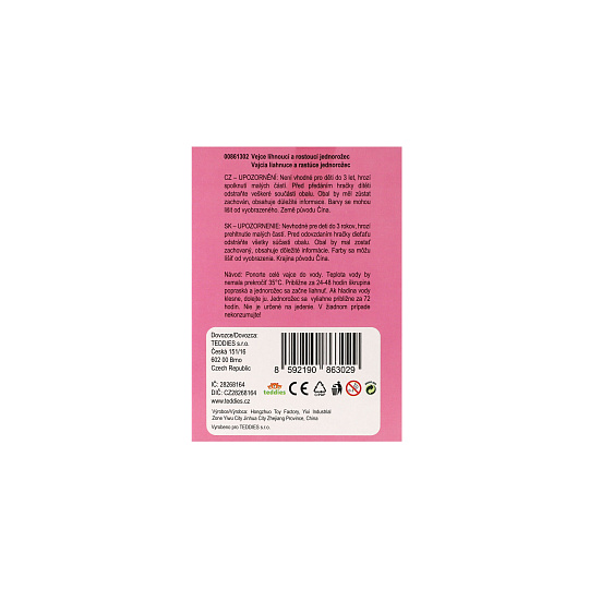 Ve vajíčku je ukryto překvapení ve formě jednorožce. Aby se ale z vajíčka vyklubal, stačí ponořit vajíčko do misky s vlažnou vodou. Přibližně za 24 - 48 hodin skořápka popraská a jednorožec se začne klubat. Děti tak mohou pozorovat, jak se jednorožec líhne z vajíčka. Jak bude vypadat se dozvědí za cca 72 hodin. Rozměr krabičky: 9,5 x 13 cm Vhodné od 3 let