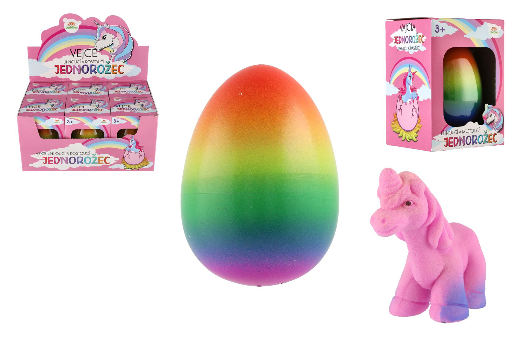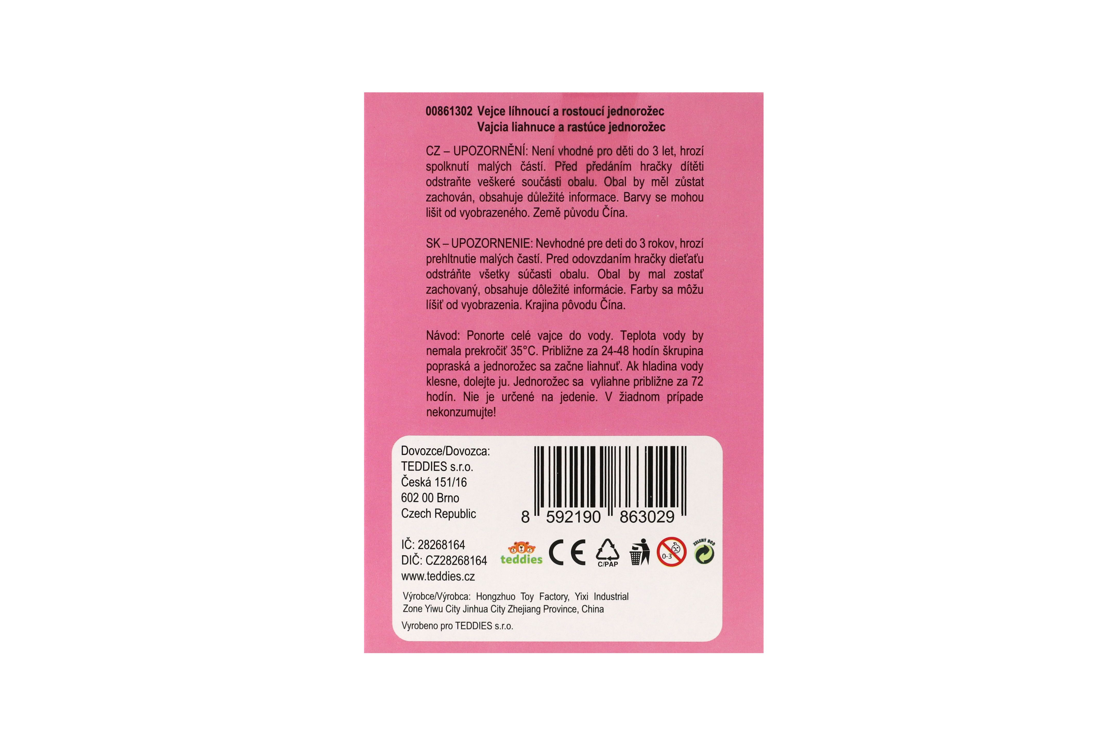 Ve vajíčku je ukryto překvapení ve formě jednorožce. Aby se ale z vajíčka vyklubal, stačí ponořit vajíčko do misky s vlažnou vodou. Přibližně za 24 - 48 hodin skořápka popraská a jednorožec se začne klubat. Děti tak mohou pozorovat, jak se jednorožec líhne z vajíčka. Jak bude vypadat se dozvědí za cca 72 hodin. Rozměr krabičky: 9,5 x 13 cm Vhodné od 3 let