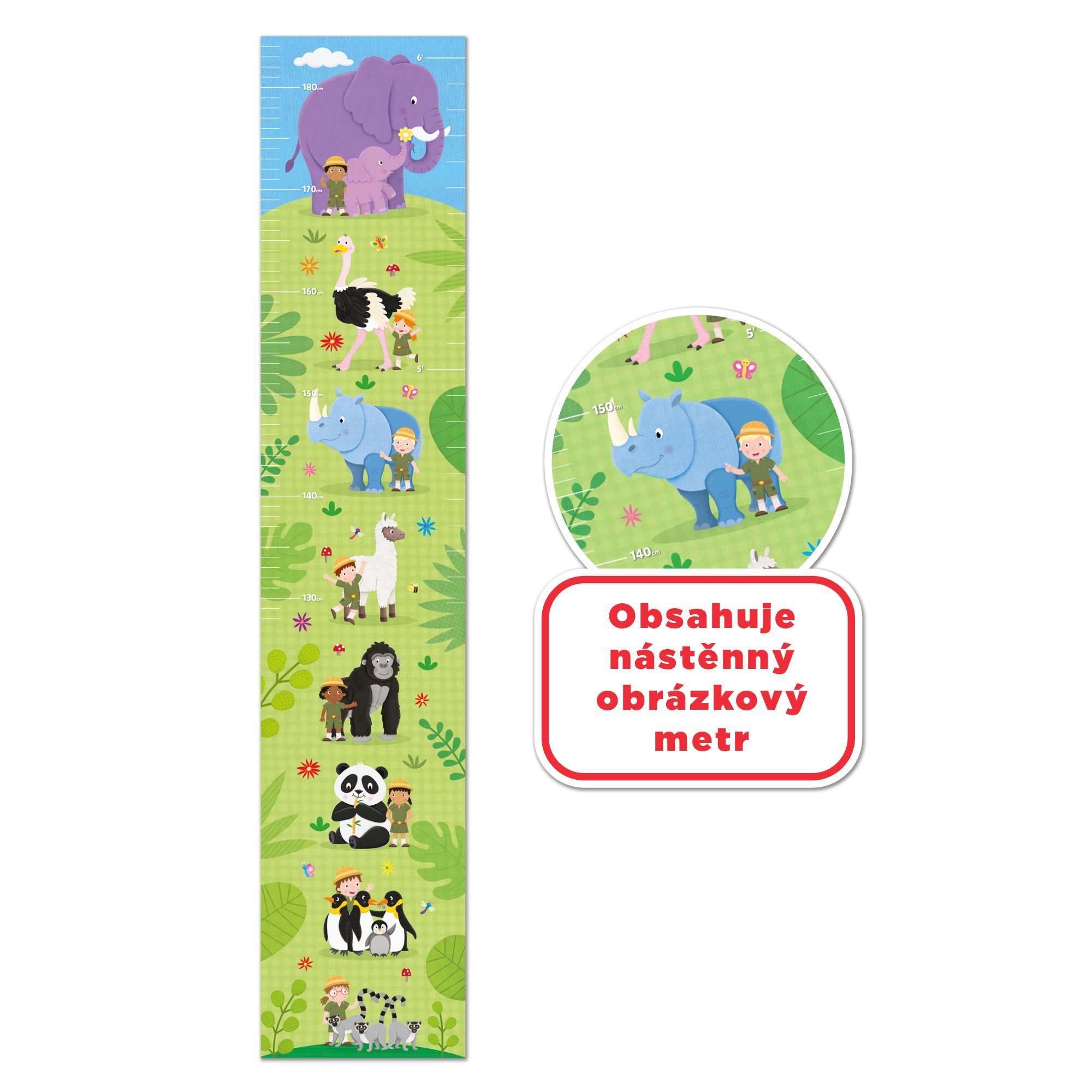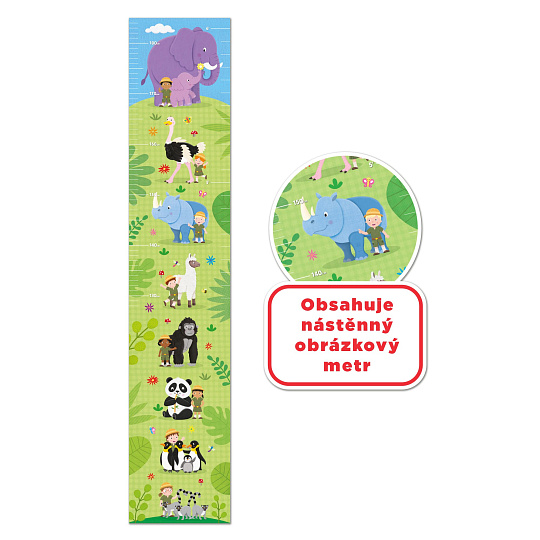 Obsahuje nástěnný obrázkový metr se zvířátky o velikosti 100 cm.
