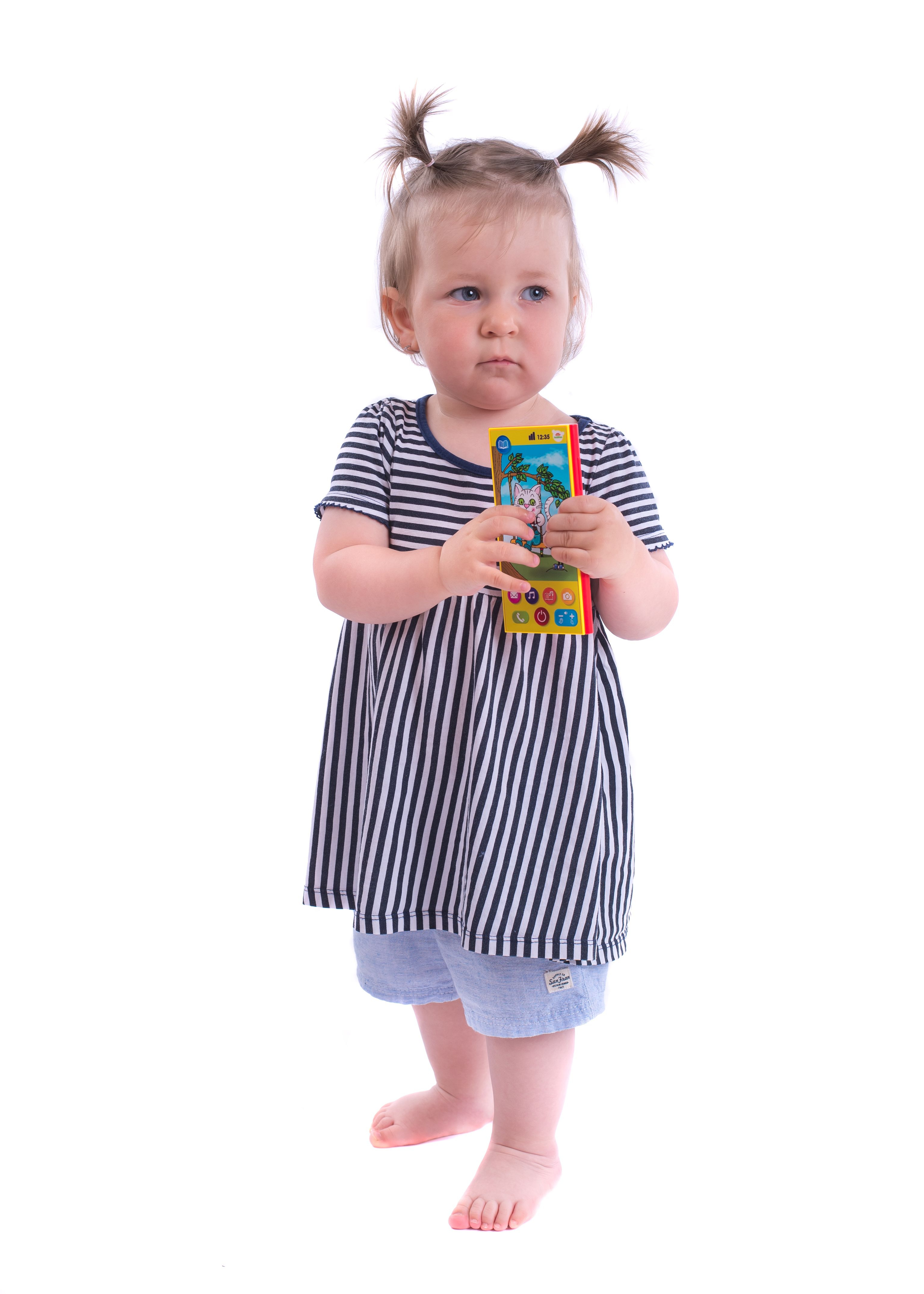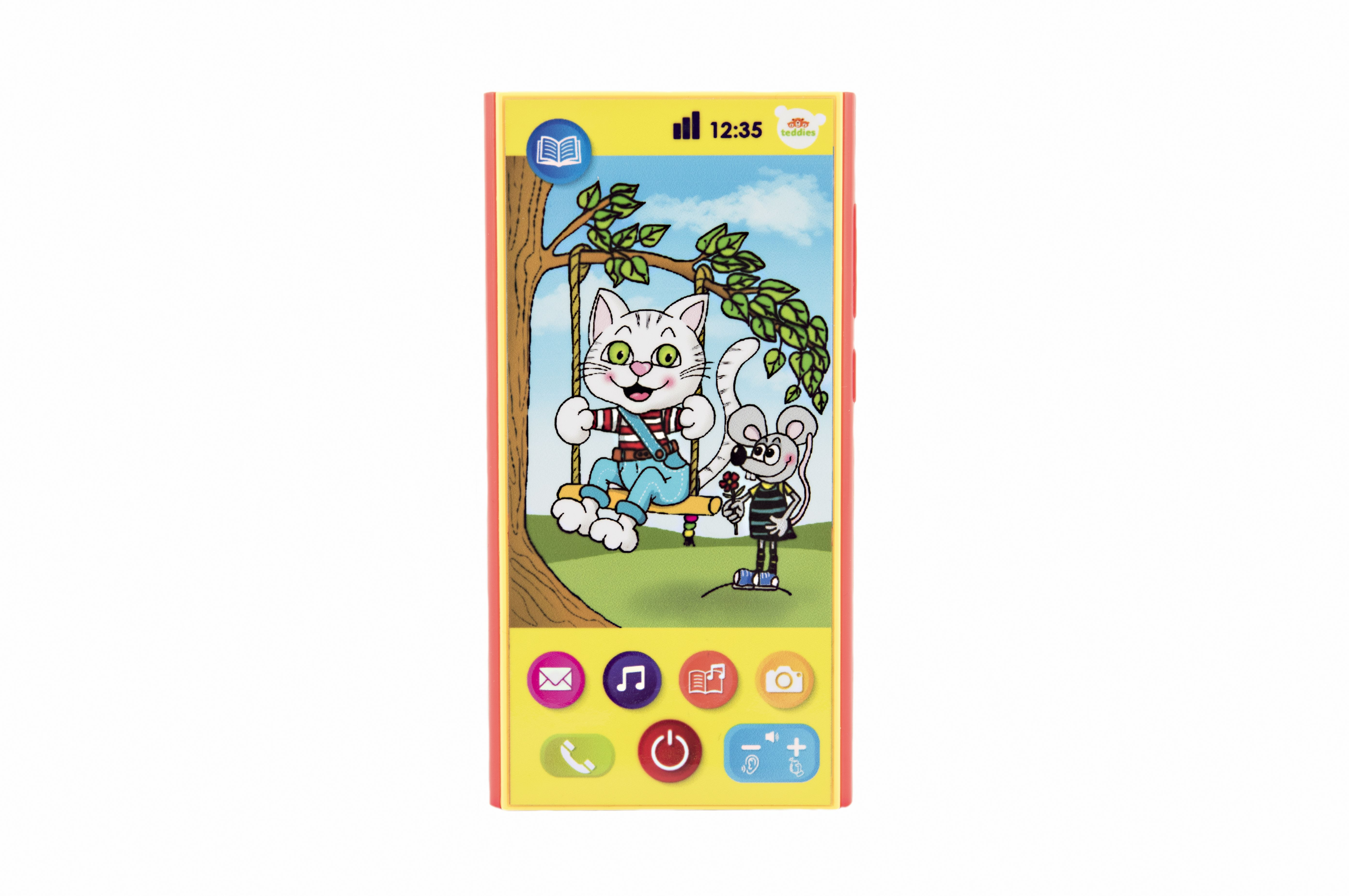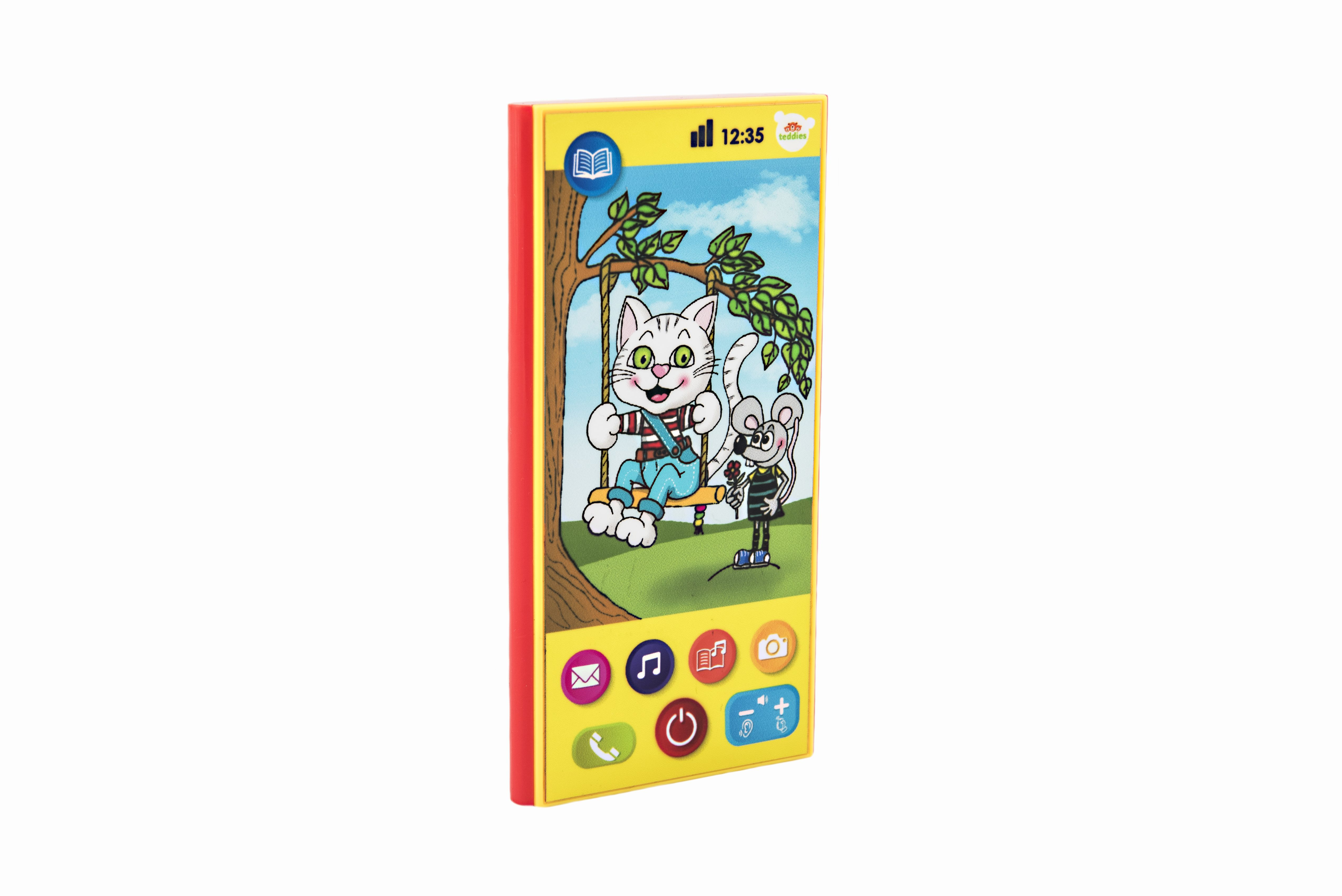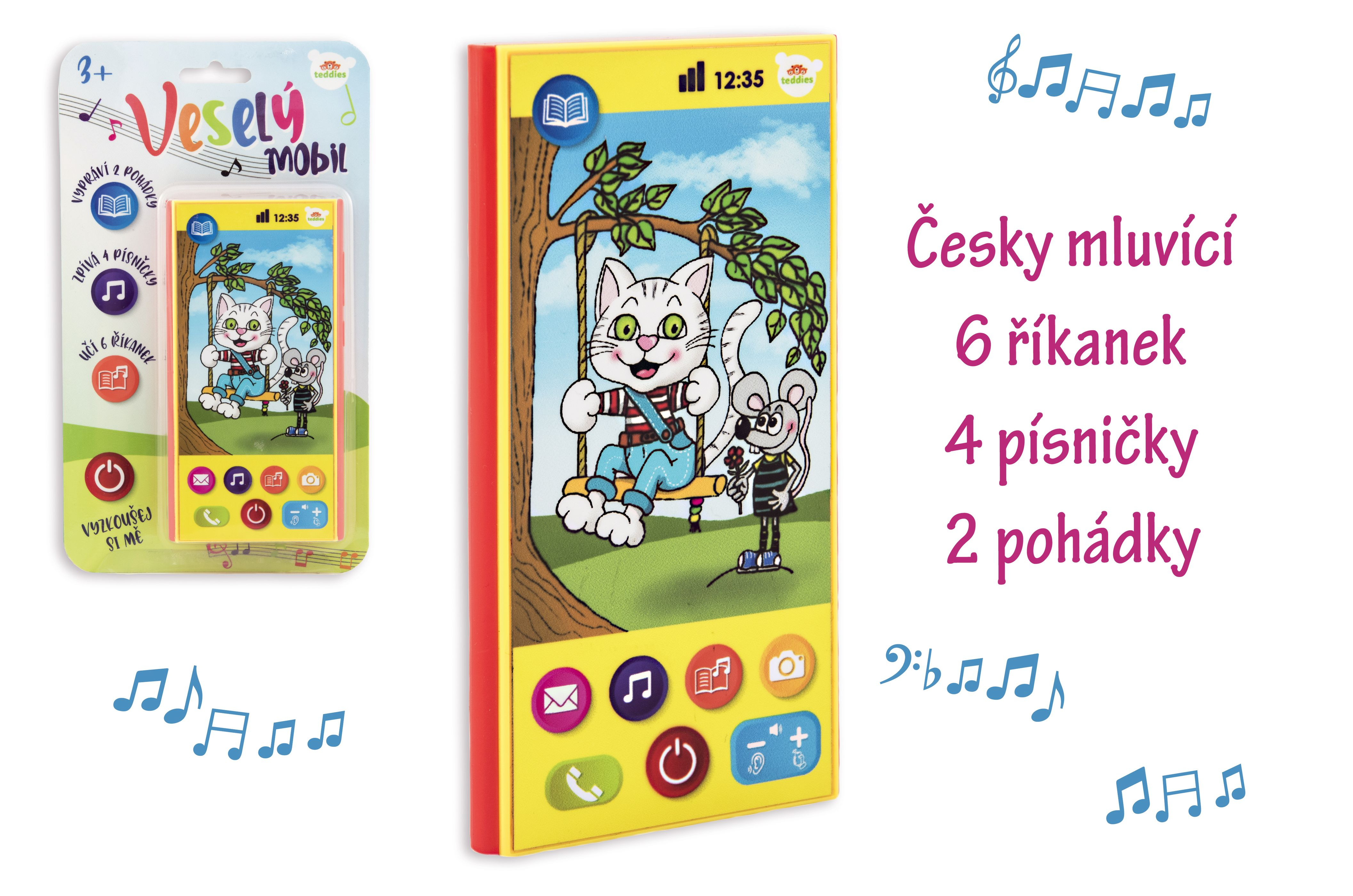 Dotykový mobil, který vypráví 2 pohádky, zpívá 4 písničky a naučí děti 6 říkanek. Děti si mohou poslechnout pohádky: O veliké řepě a Pohádku o Budce, zazpívat si písničky: Kočka leze dírou..., Mámo, táto v komoře je myš..., Houpy, houpy... a Utíkej káčo.... a naučit se říkanky: Vařila myšička kašičku..., Hrálo si koťátko..., Běží myška po světnici..., Dupy, dupy, klapy, klapy..., Naše kočka strakatá..., Včera večer při měsíčku... Na mobilu jsou tlačítka se zvukem vyzvánění, příchozí zprávy a fotoaparátu. Mobil také obsahuje tlačítko s ovládáním hlasitosti, přikládá-li dítě mobil k uchu, ztlumte hlasitost pomocí tlačítka ovládání hlasitosti "-", poslouchá-li mobil ze vzdálenosti, můžete zvýšit hlasitost pomocí tlačítka ovládání hlasitosti "+". Mobil je na 3 baterie typu AAA, které jsou součástí výrobku. Rozměry balení 13 x 23 x 2 cm. Vhodné pro děti od 3 let.