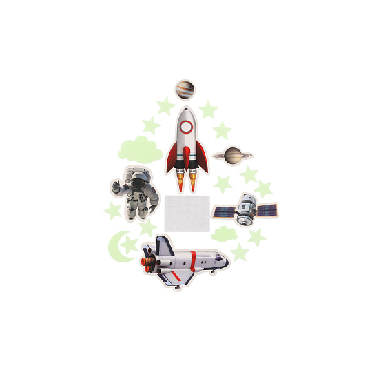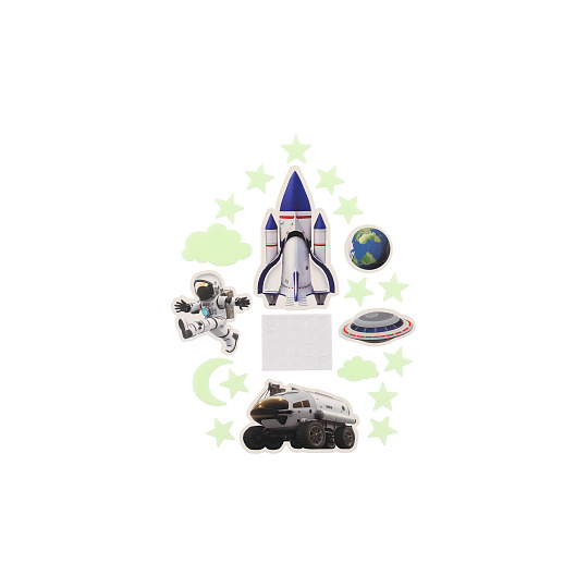 Sada obsahuje krásné vesmírné motivy, které se po nasvícení ve tmě rozsvítí a vytvoří okouzlující atmosféru plnou hvězd a planet. Tyto dekorace jsou ideální pro malé objevitele vesmíru, kteří si chtějí přinést kousek galaxie domů. Svítící vesmírné motivy nejenže zpříjemní večerní hodiny, ale také pomohou dětem usnout v kouzelném prostředí plném hvězd. Rozměry balení 17 x 25 x 2 cm. Vhodné pro děti od 3 let.
