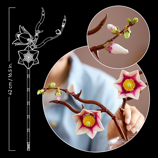 Po sestavení se Větvičky magnólie stanou elegantním doplňkem vašeho interiéru. Můžete je vystavit samostatně nebo je zkombinovat s dalšími stavebnicemi z řady LEGO® Botanicals (prodávají se samostatně) a vytvořit tak rozsáhlejší a osobitější květinovou kompozici.