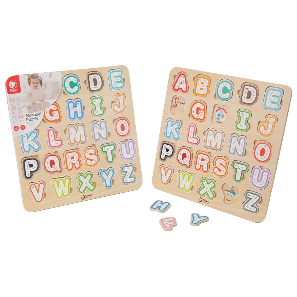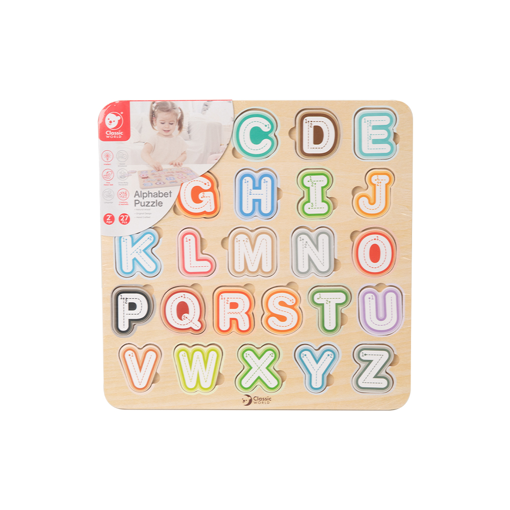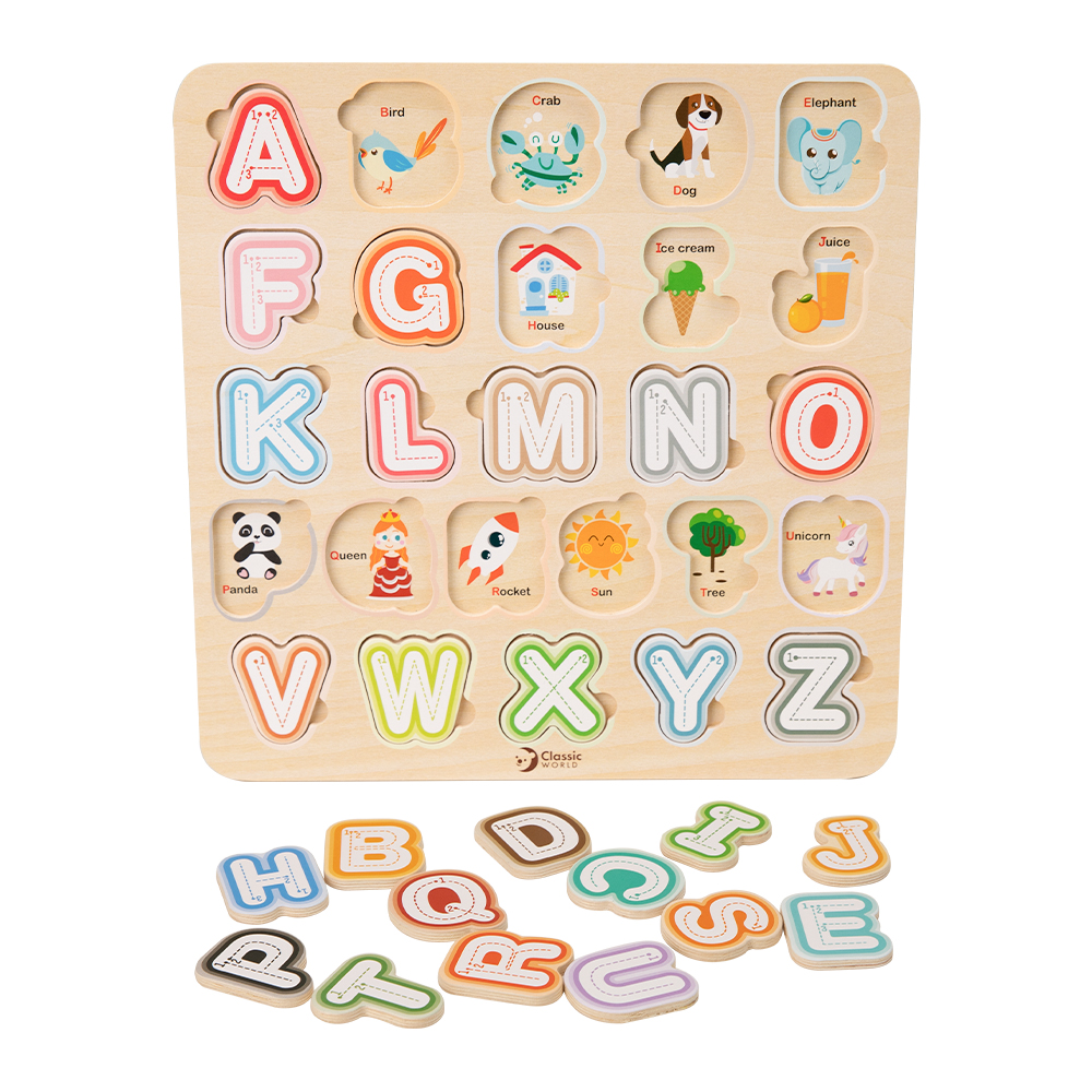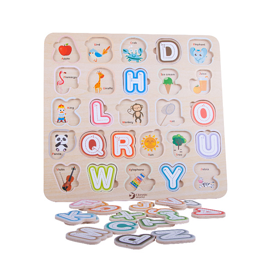 Vzdělávací hra, díky které se děti zábavnou formou učí poznávat písmenka, skládat slovíčka nebo celé věty. Dřevěné dílky vyřezávaných puzzlí s písmenky musí dítko umístit do správného otvoru. Učíme tak jemnou motoriku ruky a prostorovou představivostu dětí. Navíc dítě objevuje první základy angličtiny, pod písmenkem se vždy schovává obrázek v angličtině. Rozměry balení 30 x 30 x 1 cm. Vhodné pro děti od 2 let.
