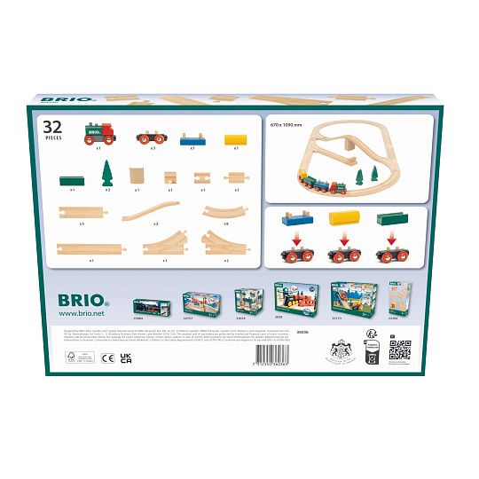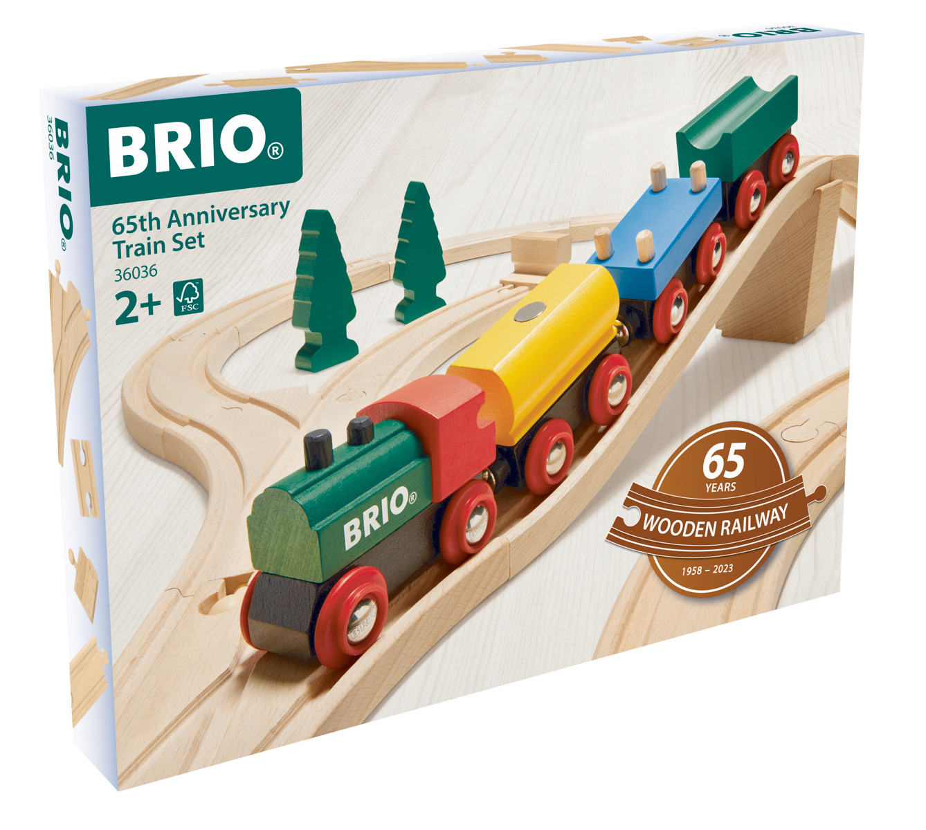 Oslava klasického vláčku se sadou k 65. výročí dřevěného vláčku. Vlaková souprava vyrobená výhradně ze dřeva je inspirována ikonickými železničními produkty BRIO, které byly poprvé uvedeny na trh v roce 1958. 32dílná sada je vyrobena z evropského bukového dřeva s certifikací FSC a obsahuje klasický vláček BRIO se 3 pestrobarevnými dřevěnými vagony, mostem, hroty a dřevěnými stromy pro scénickou dekoraci krajiny. Rozměry dráhy: 109x67x7,3cm. Věk: 2+