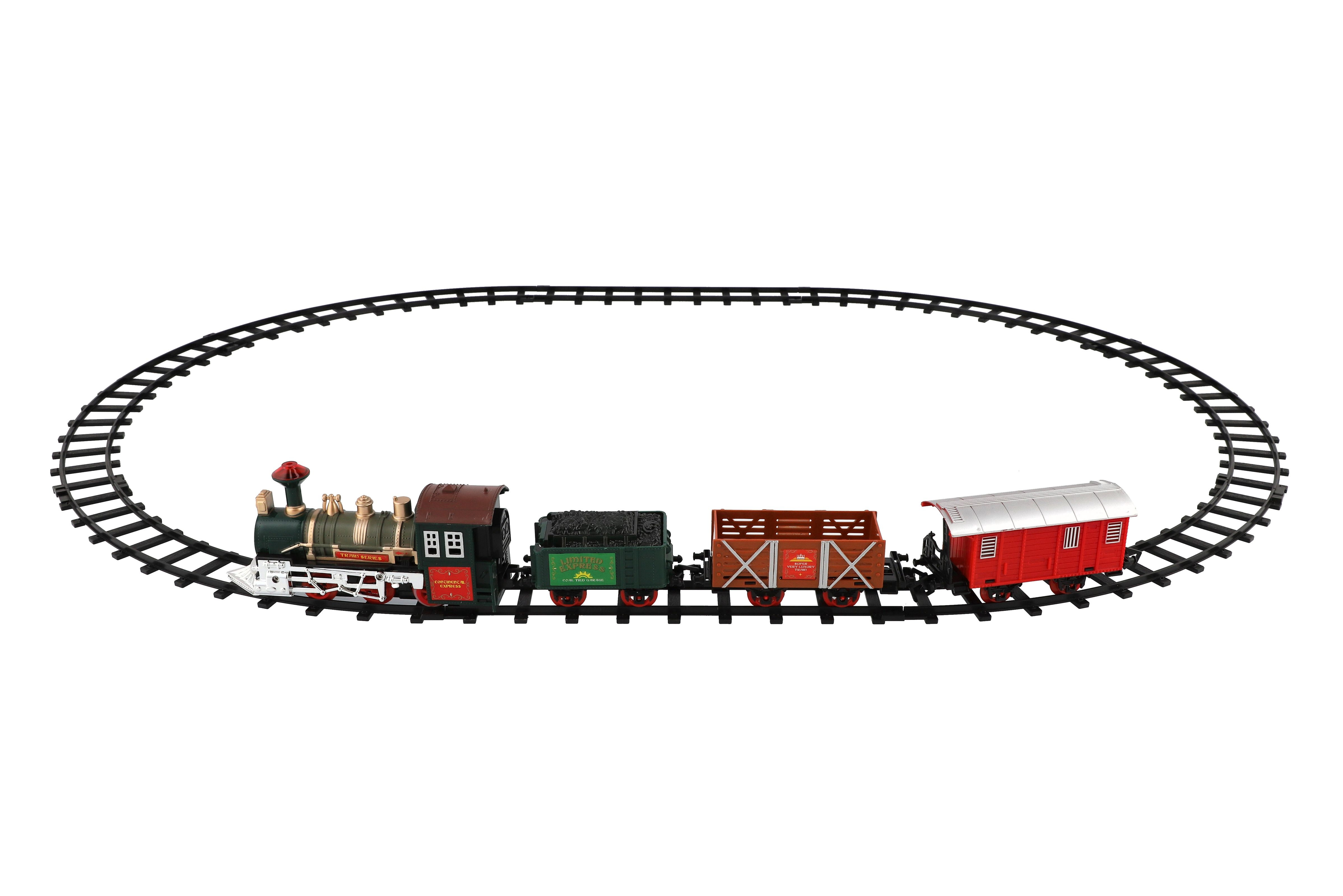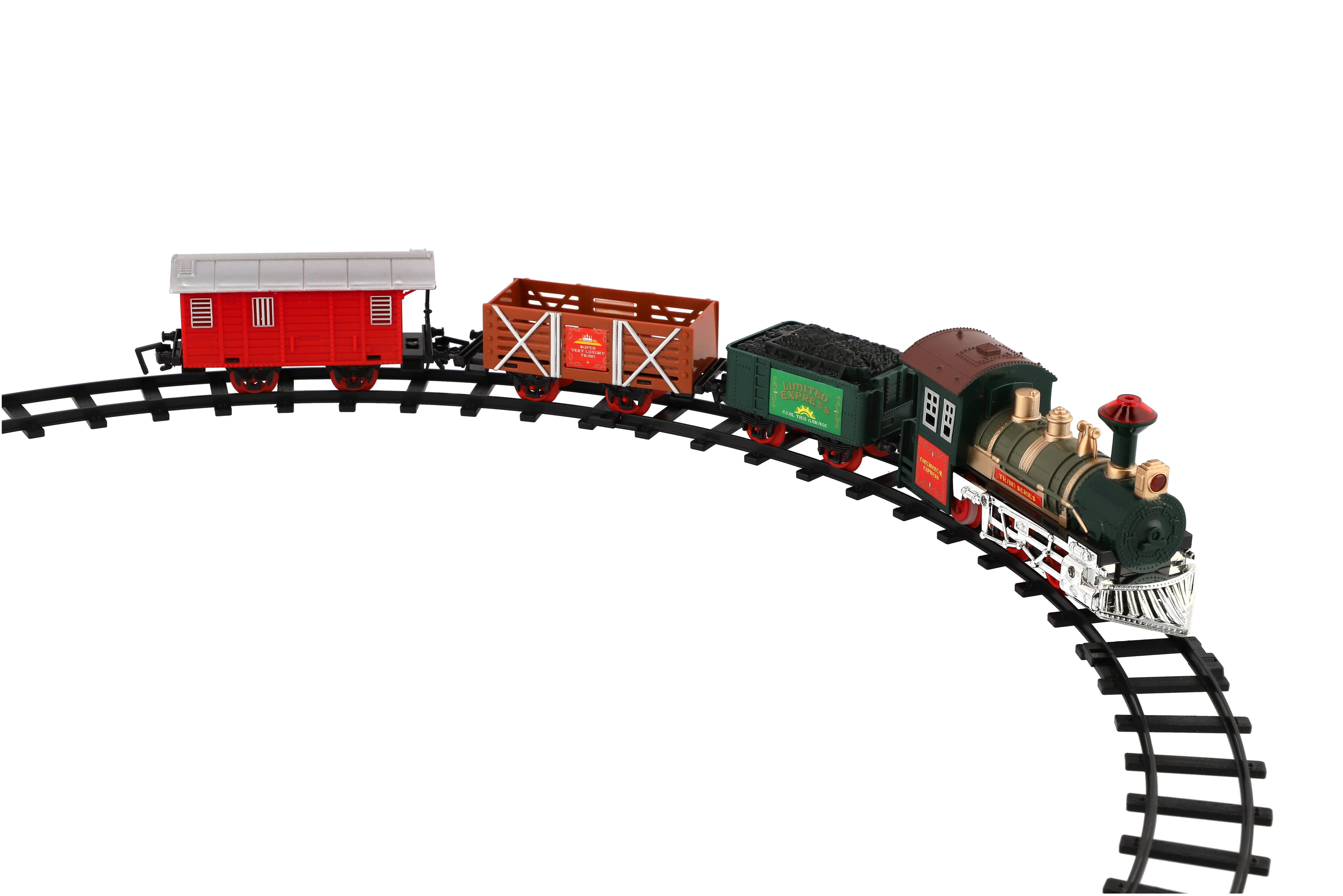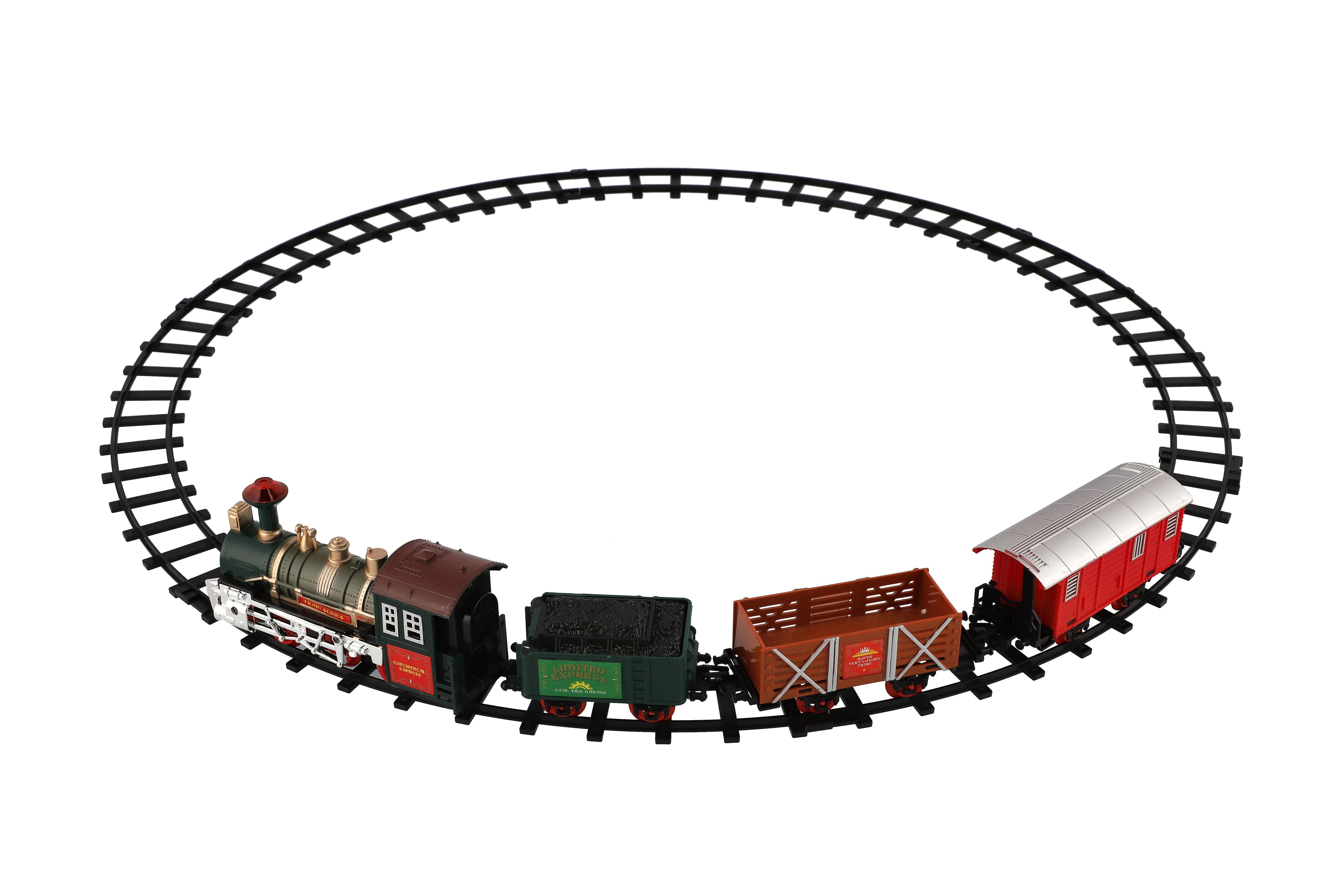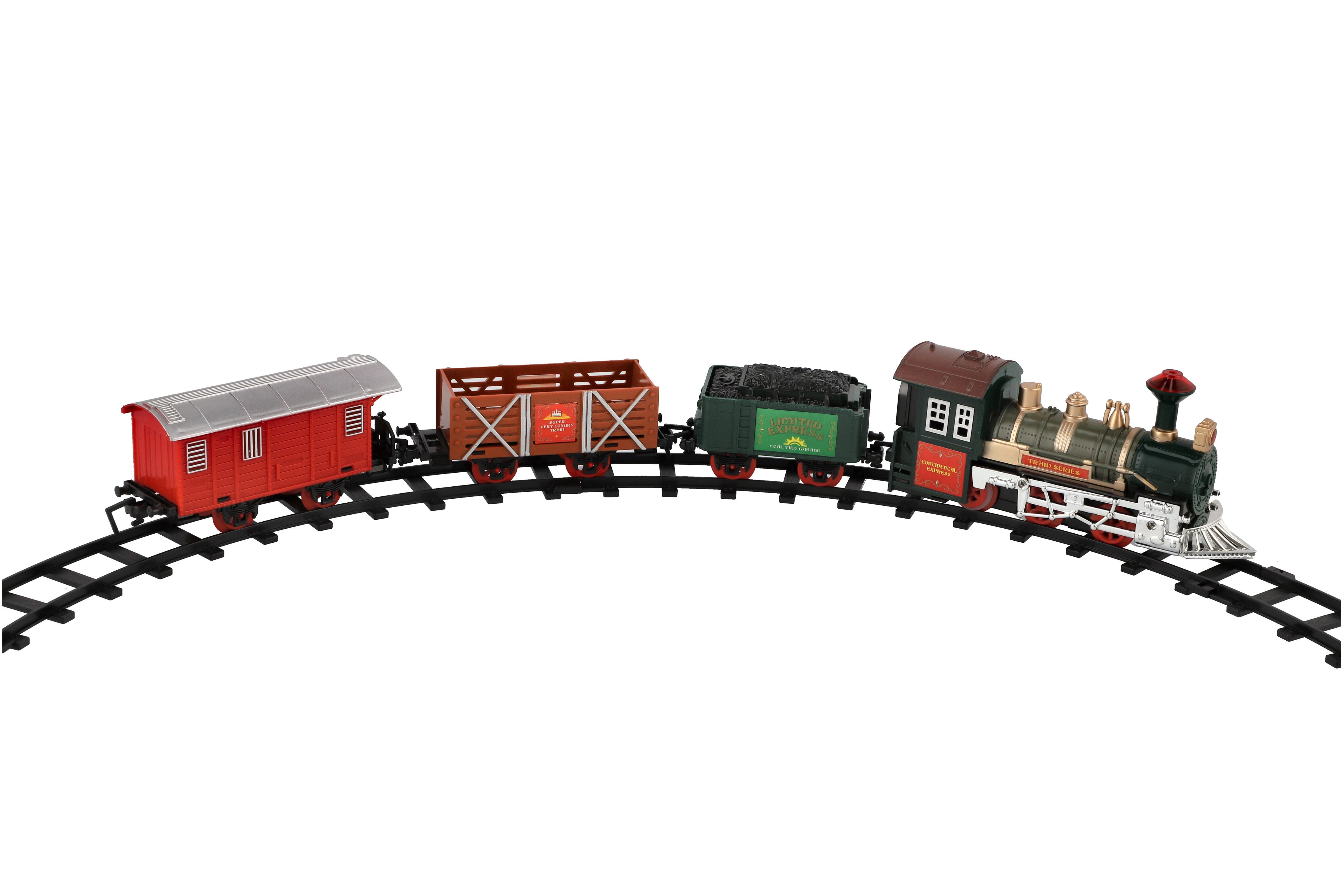 Tato super vlaková souprava kolejemi nadchne jistě každého kluka. Postav si trať a nech vláček jezdit. Občas nezapoměň zastavit a nechat vystoupit a nastoupit nové cestující... Balení obsahuje: lokomotivu, které svítí světla, 3 vagónky, 6 ks zatáček a 2 ks rovných kolejí. K provozu jsou třeba 2 x AA baterie do mašinky (nejsou součástí). Rozměry okruhu: 107 cm Rozměr balení: 41 x 28 x 6 cm Nevhodné pro děti do 3 let