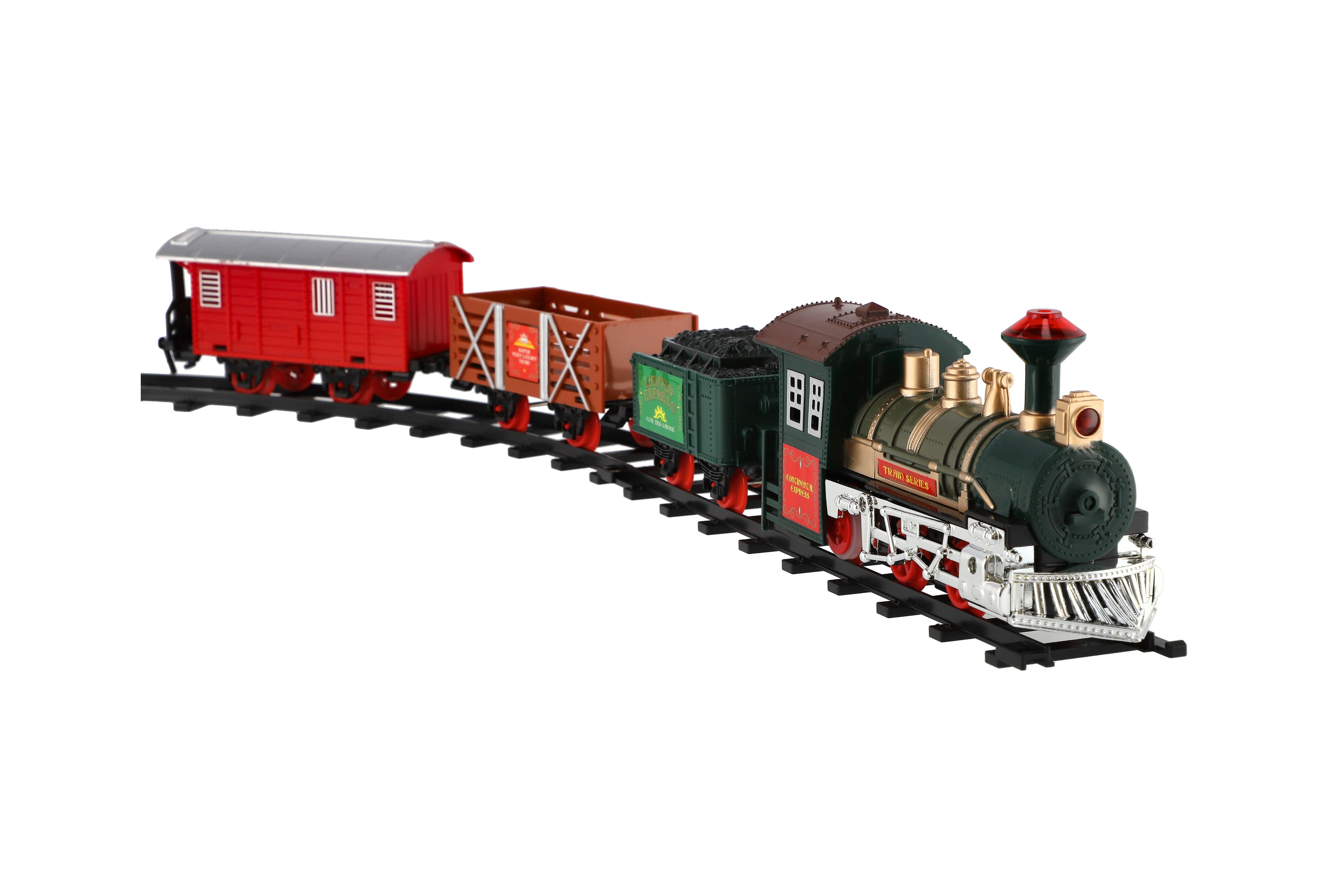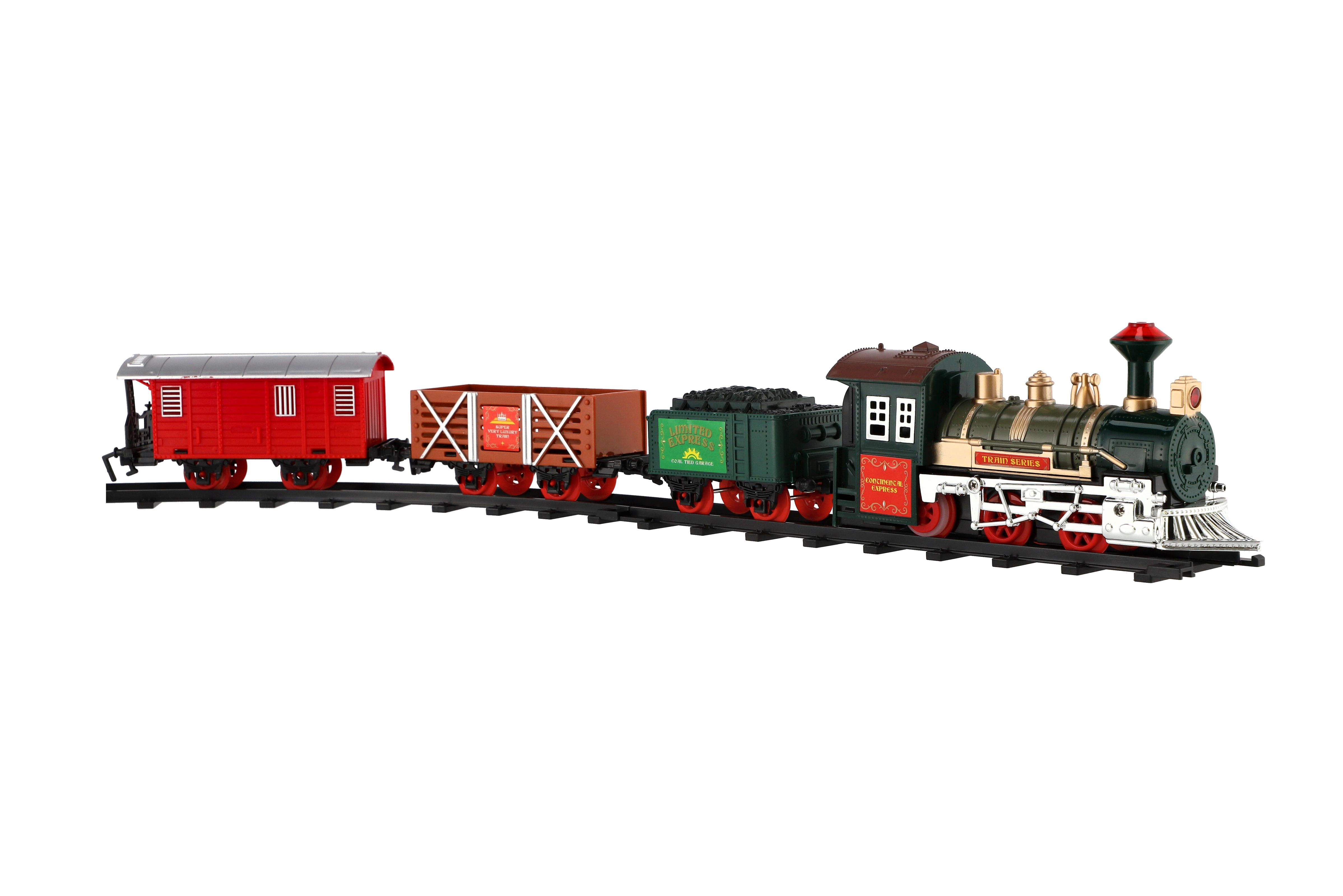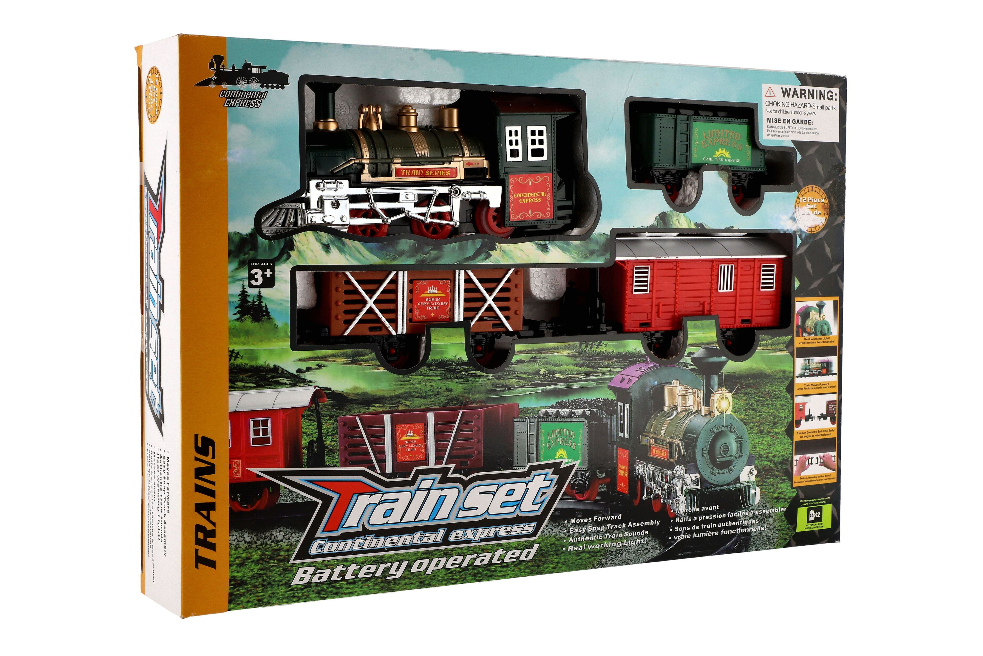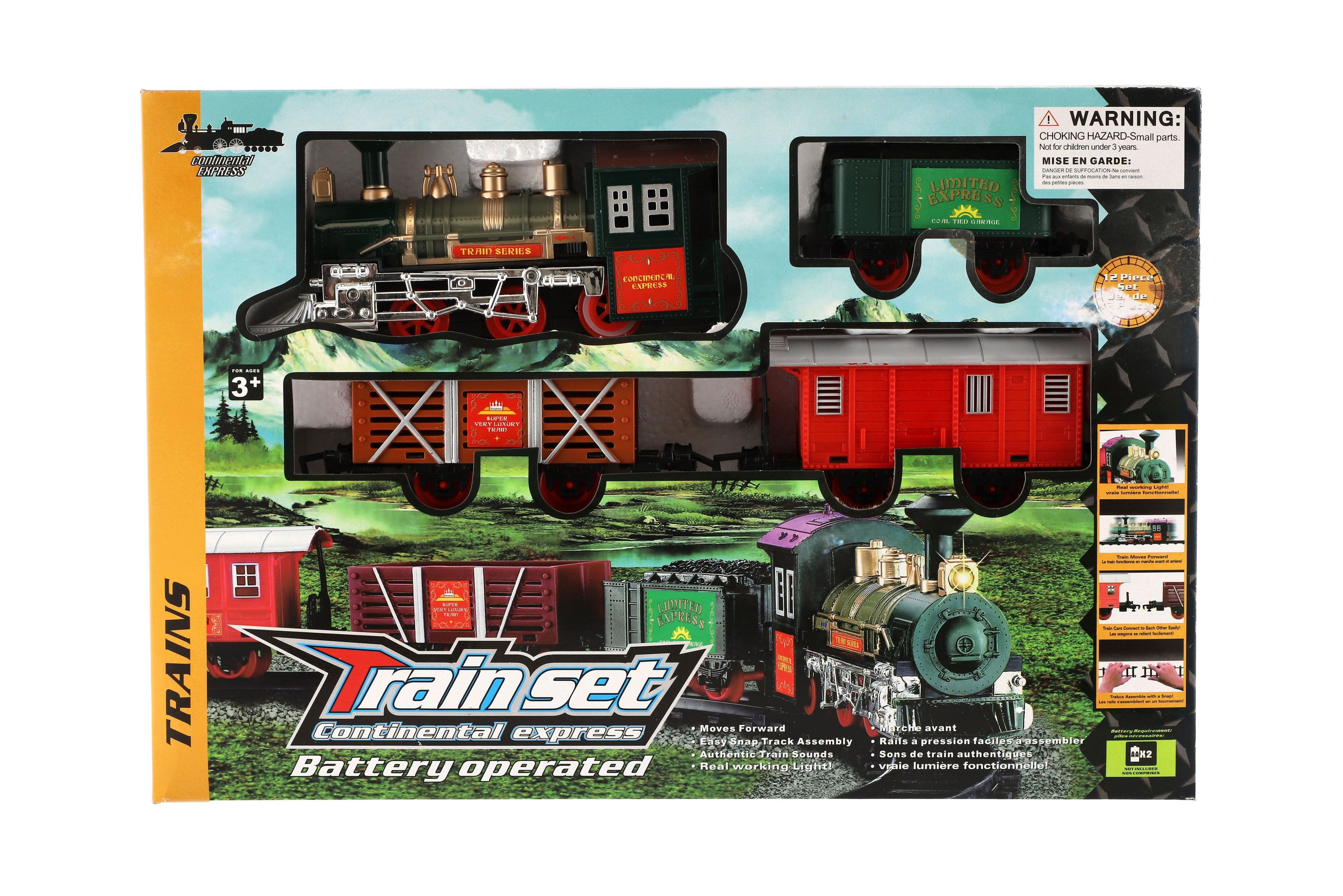 Tato super vlaková souprava kolejemi nadchne jistě každého kluka. Postav si trať a nech vláček jezdit. Občas nezapoměň zastavit a nechat vystoupit a nastoupit nové cestující... Balení obsahuje: lokomotivu, které svítí světla, 3 vagónky, 6 ks zatáček a 2 ks rovných kolejí. K provozu jsou třeba 2 x AA baterie do mašinky (nejsou součástí). Rozměry okruhu: 107 cm Rozměr balení: 41 x 28 x 6 cm Nevhodné pro děti do 3 let