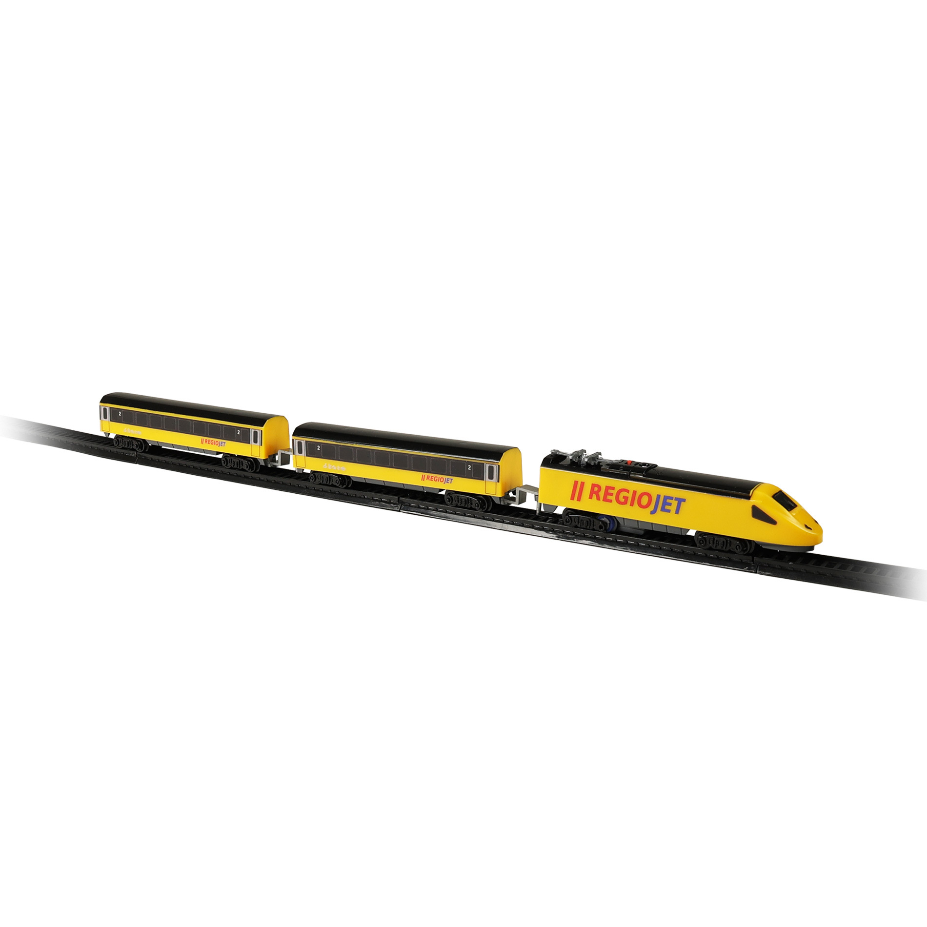 Milujete cestování vlakem? Tak sestavte koleje, postavte na ně lokomotivu, připojte vagóny a vzhůru za dobrodružstvím! Originální žlutý vlak RegioJet od Student Agency obsahuje žlutou lokomotivu a 2 žluté vagónky, 8 zahnutých a 4 rovné koleje. Lze vytvořit kolejiště až do velikosti 96 x 58 cm. Rozteč kolejí je 1,4 cm. Lokomotiva měří na délku 14 cm a vagón 13,5 cm. Lokomotiva jezdí na 1 ks AA baterie (není součástí), na střeše lokomotivy vypínačem ON/OFF (zapnuto/vypnuto) uvedete vlak do chodu. Vlak RegioJet MINI lze kombinovat s vlakem Pendolino MINI a Slovenské dráhy MINI.