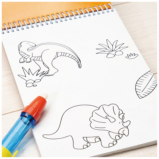 Sada kouzelných omalovánek Vodní magie pro nejmenší s opakovaně použitelnými obrázkovými deskami na pevném očku a novým velkým vodním perem. Tyto zábavné omalovánky obsahují opakovaně použitelné obrázky, které se vybarví vodním perem. Naplníme pero vodou a jeho pomocí dítě odkrývá schované obrázky dinosauřích mláďat. Obrázky se jako zázrakem vybarví a barvy pak zase zmizí, takže je děti mohou vybarvovat pořád dokola. Ideální pro cestování.
