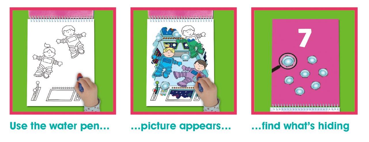 Vychází ze hry „Who‘s Hiding?“ (Na schovávanou). Tyto omalovánky obsahují ještě další aktivitu. Pomocí vodního pera dítě může odkrýt obrázek se zvířátky a předměty. Obrázky se vybarví a pak zase zmizí, a tak pořád dokola. Ideální pro cestování.