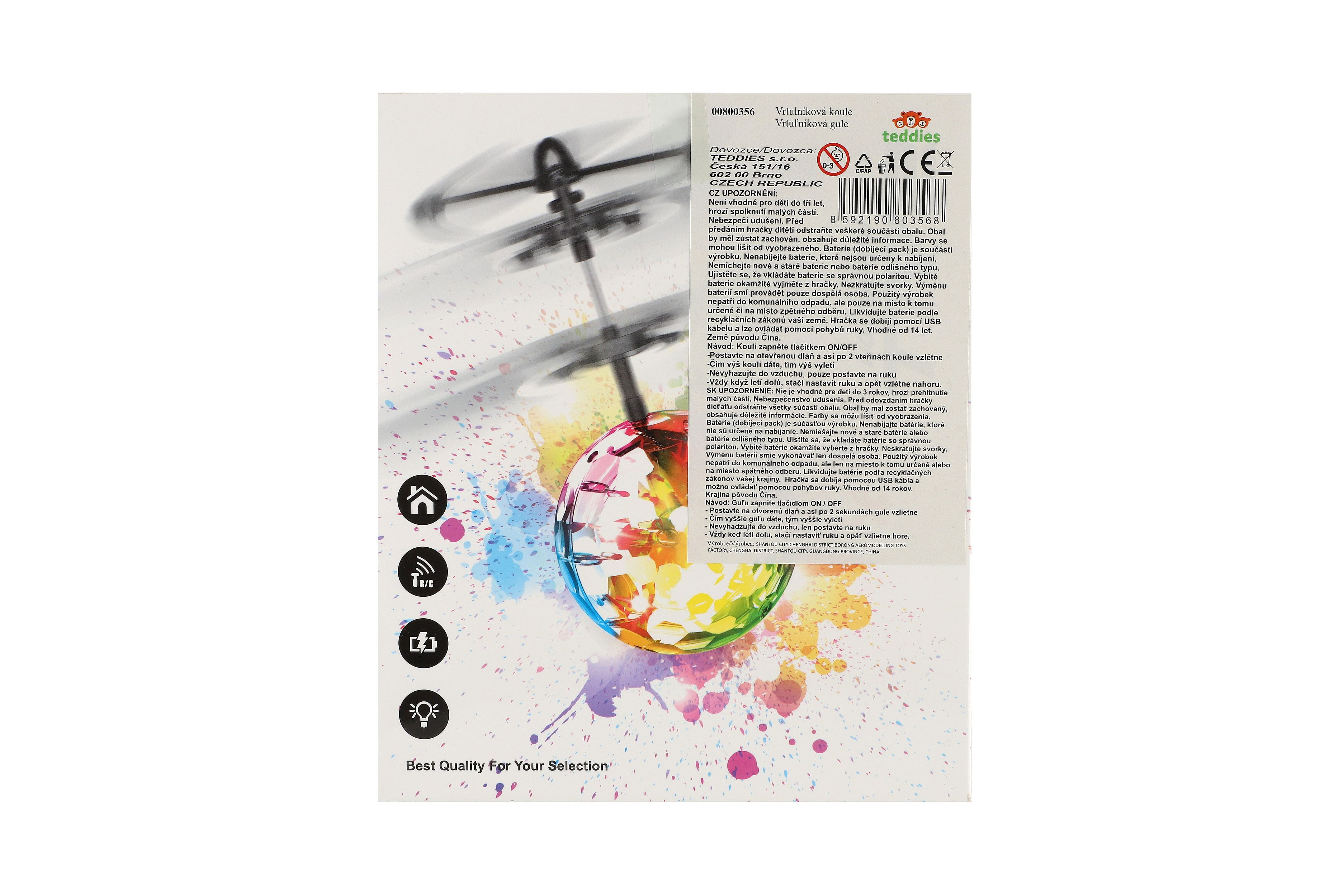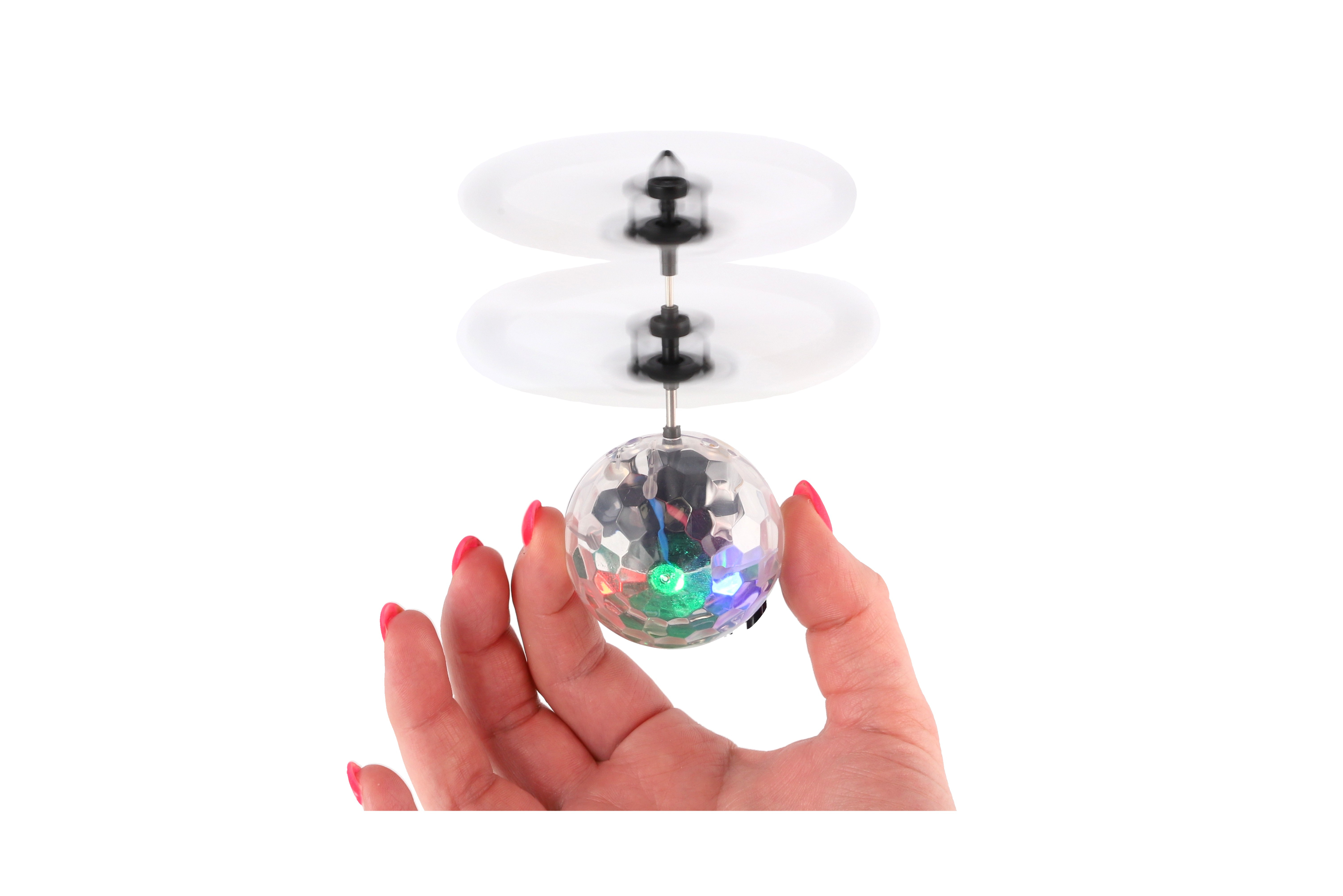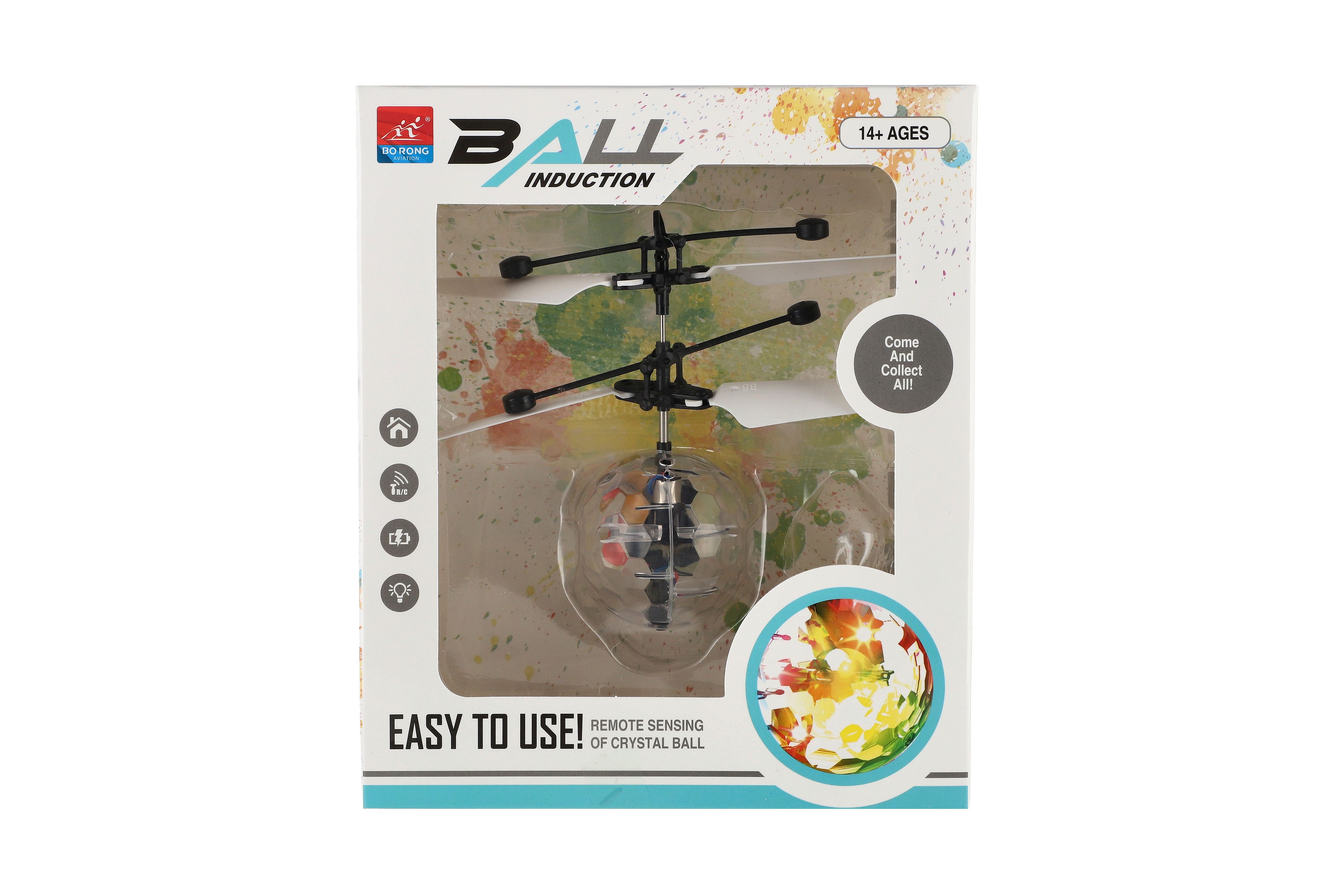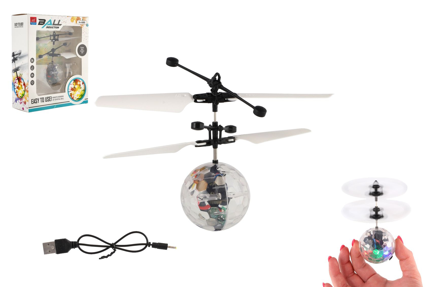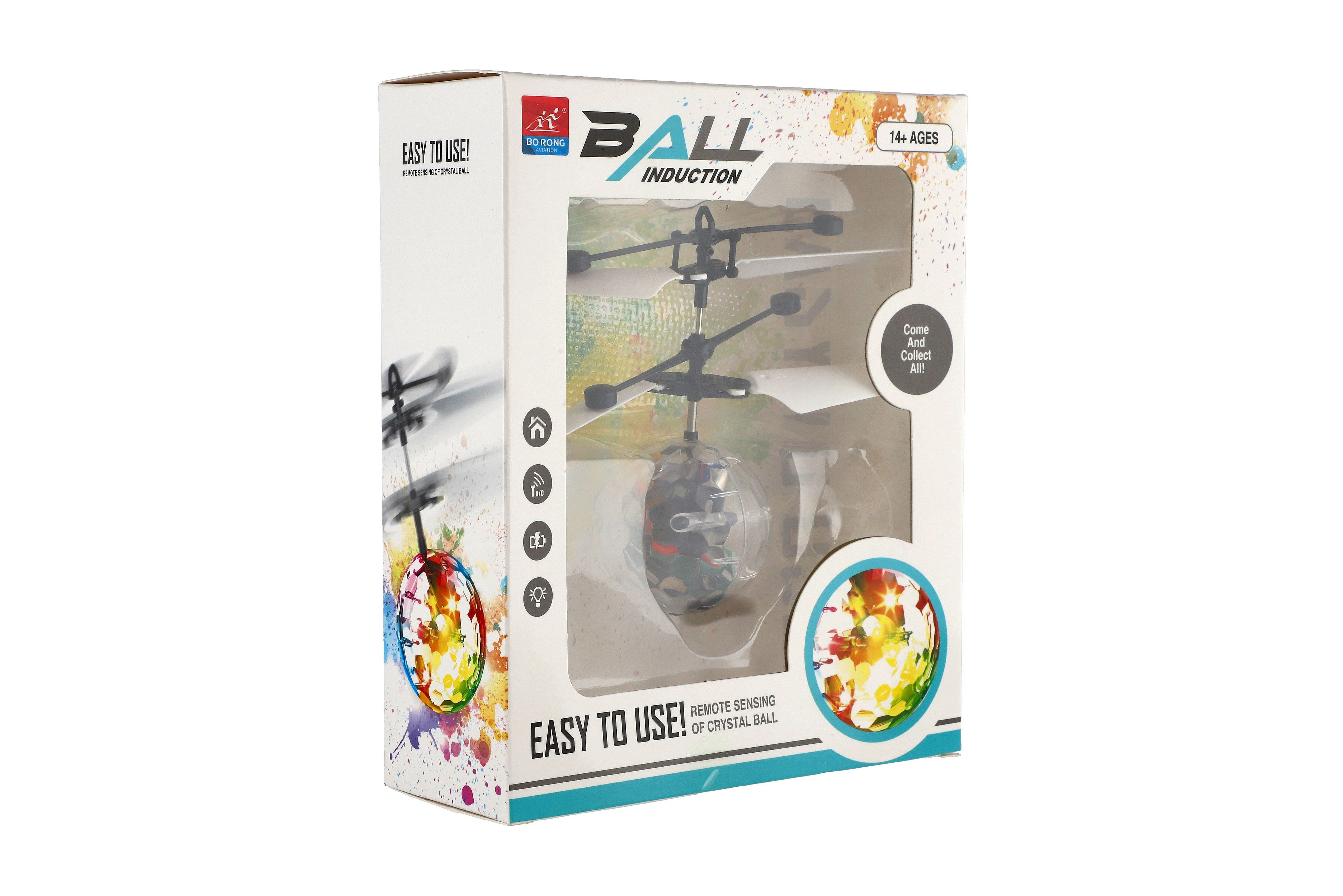 Vrtulníková koule se zabudovaným čidlem nabízí možnost ovládat její let pomocí dlaně. Děti mohou rukou určovat výšku letu. Za letu koule svítí. Nevyhazujte do vzduchu, pouze postavte na ruku. Balení obsahuje také USB kabel pro rychle dobíjení. Rozměry balení 16 x 19 x 6 cm. Vhodné pro děti od 14 let.