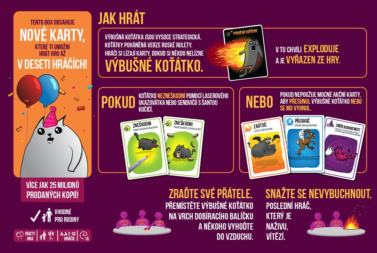Výbušná koťátka jsou extrémně strategickou verzí ruské rulety (jen s koťátky). Hráči si dobírají karty, dokud si někdo nelízne Výbušné koťátko, exploduje, umře a je vyřazen ze hry. Pokud ten hráč nemá kartu Zneškodni, která mu umožní zneškodnit koťátko pomocí laserového ukazovátka, podrbáním na bříšku nebo sendviče s šantou kočičí. Úkolem všech ostatních karet v balíčku je pomoci hráčům držet se Výbušným koťátkům z cesty (nebo je nastrčit do cesty ostatním).