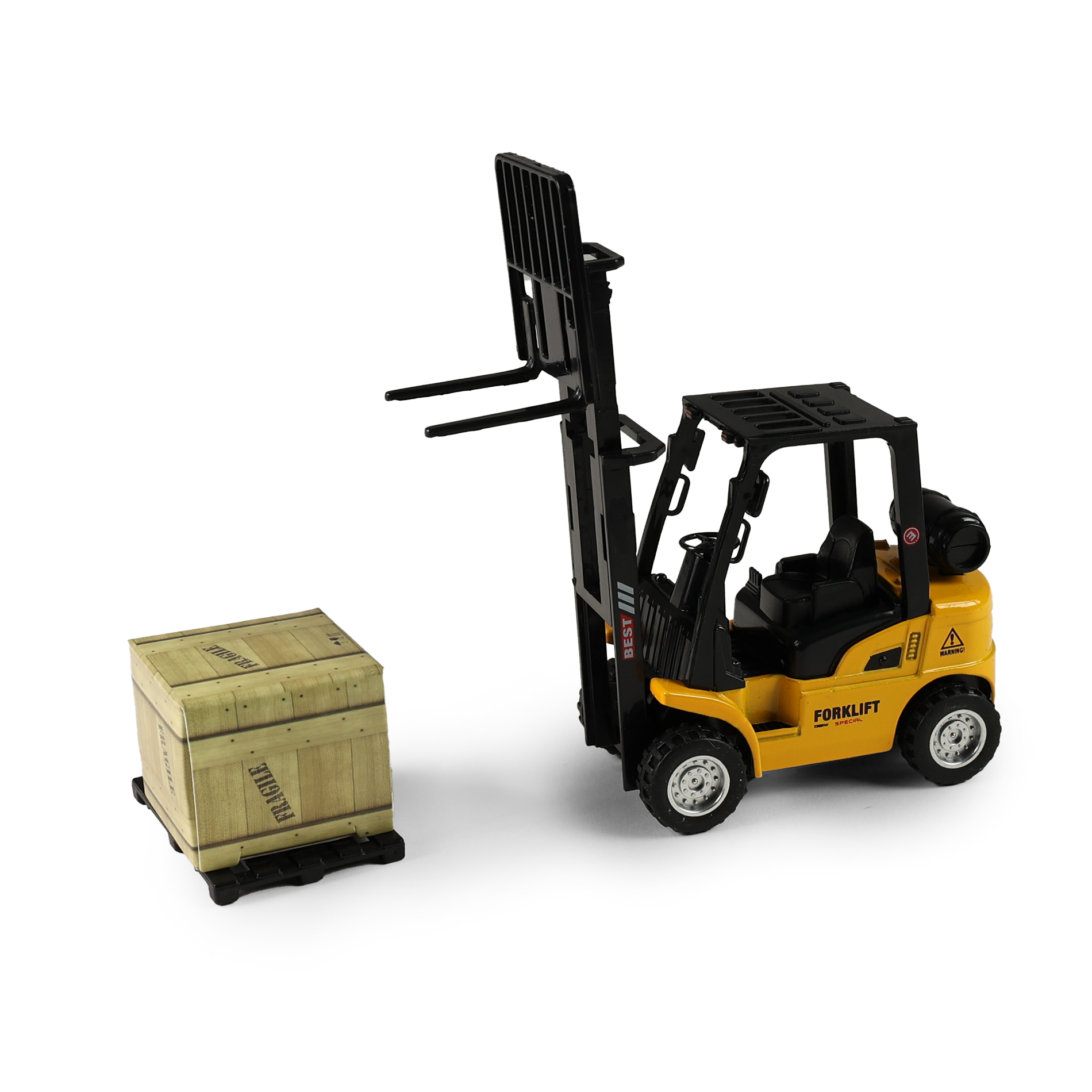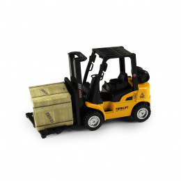Vysokozdvižný vozík je skvělým doplňkem každé dětské sbírky stavebních nebo pracovních strojů. Díky zpětnému chodu se vozík po natažení dozadu sám rozjede vpřed, což zajišťuje zábavnou a dynamickou hru. Jeho délka je cca 13 cm a má pohyblivou vidlici. Vozík je ideální pro děti, které milují techniku, staveniště nebo hru na profese.