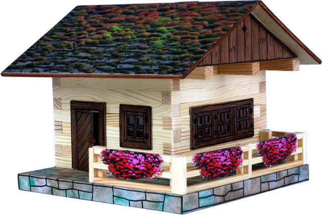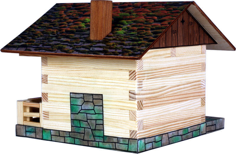 Dřevěná slepovací stavebnice Walachia - Roubená chaloupka. Slepovací stavebnice Walachia jsou dřevěné modely domečků a staveb z Valašského kraje v měřítku 1:32. Základem jsou dřevěné hranolky 9x9 mm a k tomu jsou v sadě vždy všechny papírové doplňky - okna, dveře, střešní části atd. Pro lepení se používá lepidlo Herkules, není však součástí stavebnice. Přiložený je montážní návod a malé kapitoly z historie lidové architektury. Níže je označení obtížnosti číslem 1 - 5, přičemž 1 je nejlehčí. Rozměry: 15 x 10 x 12 cm Počet dílů stavebnice: 64 Obtížnost: 2