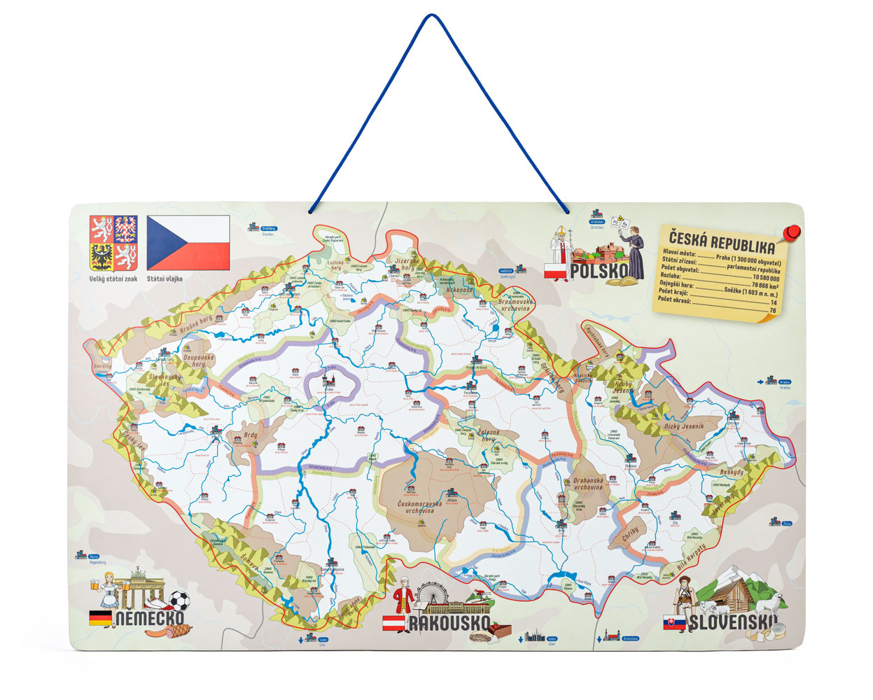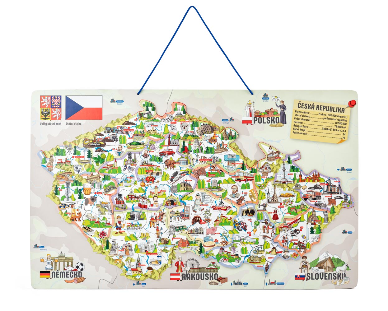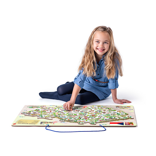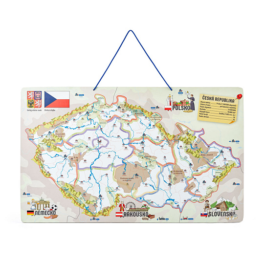 Naučné puzzle, školní pomůcka a společenská hra v jednom! Cílem je naučit vnímat dítě naši republiku jako stát, který je plný zajímavostí. Současně se zde dítě naučí rozčlenit naši republiku do jednotlivých okresů a určit jejich hlavní města. Na podkladové desce jsou rovněž zakresleny řeky a pohoří. Dítě přikládá dílky znázorňující jednotlivé okresy na podkladovou magnetickou plochu. Hranice jednotlivých okresů jsou vyznačeny tenkou červenou linkou, podle které dítě jednoduše určí, kam který dílek patří. Později už bezpečně ví a osvojí si znalost, kde se jednotlivé okresy nacházejí, s kterými sousedí atd...