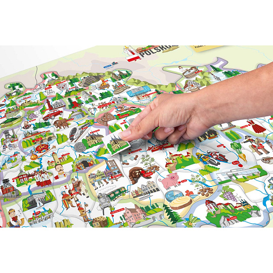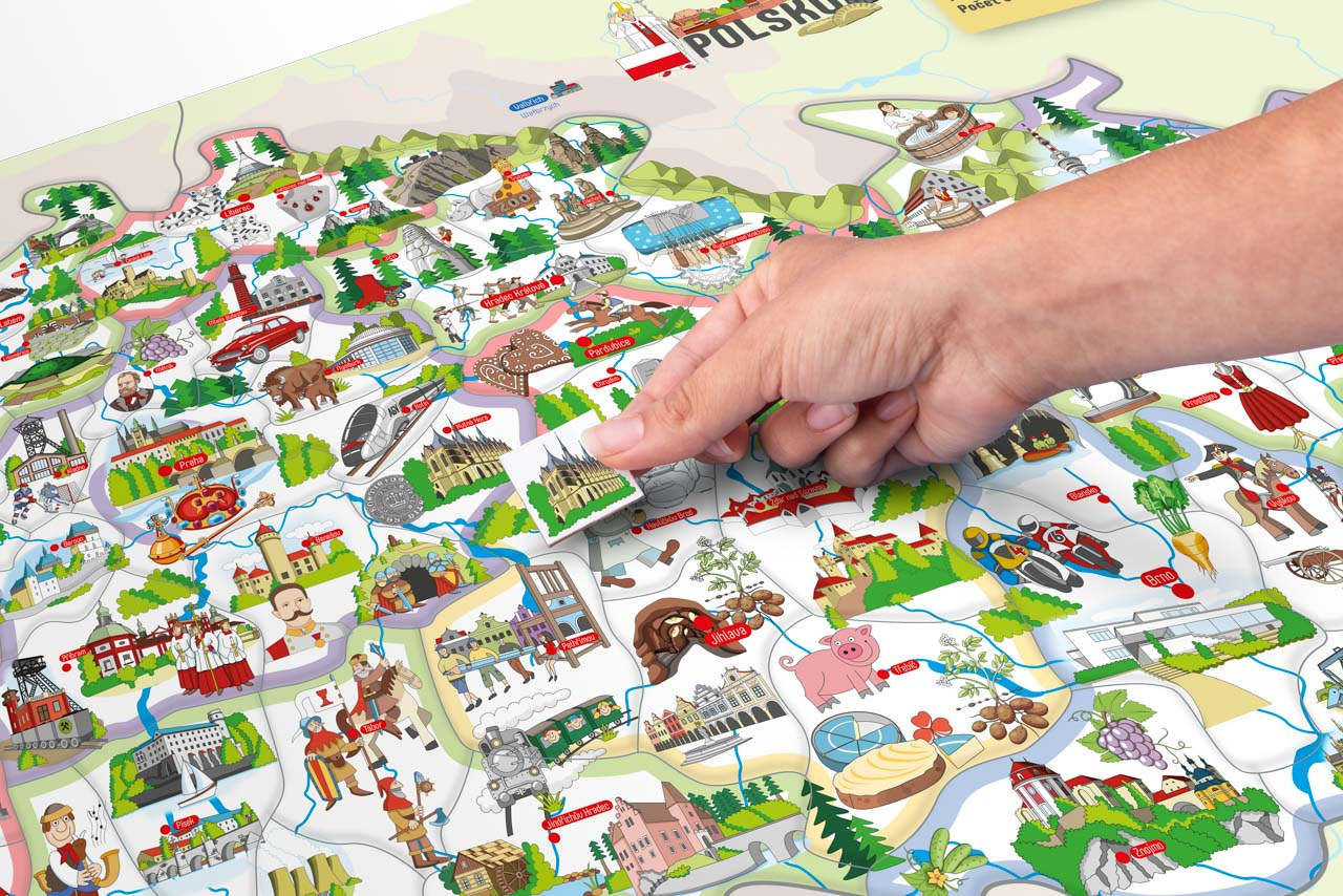 Díky obrázkům umístěným na každém dílku si děti ihned uvědomí, co je pro každý okres charakteristické, co se kde pěstuje, vyrábí, těží, kde jaká zvířata žijí, event., kde se jaká stavba, budova, hrad či zámek nachází. S kompletně poskládanou mapou si pak s rodiči nebo kamarády zahrají hru, která bystří smysly a trénuje postřeh.
