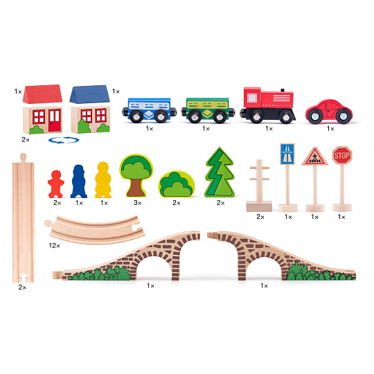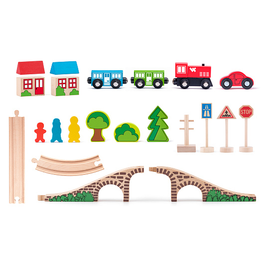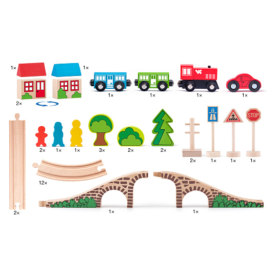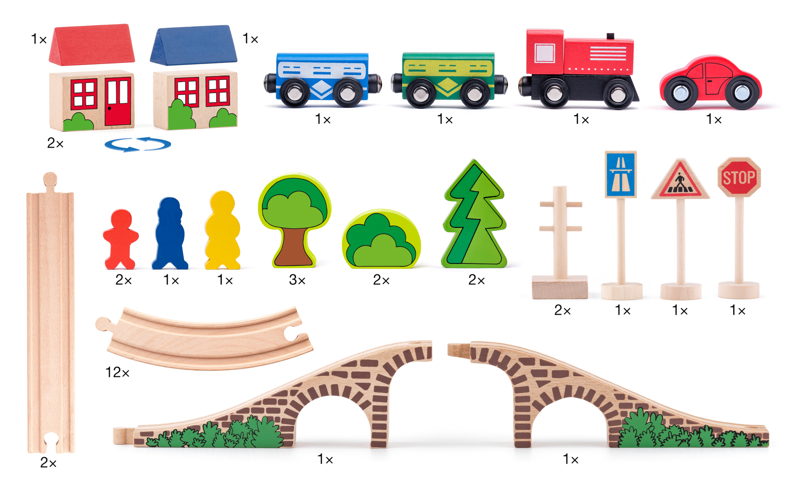 Set obsahuje 16 dílů různých kolejí k vláčkodráhám: 4 dlouhé rovné, 2 středně dlouhé rovné, 2 krátké rovné, 2 výhybky, 2 krátké zatáčky, 2 dlouhé zatáčky a 2 speciální spojovací koleje se stejnými spojovacími prvky (čudlík - čudlík, dírka - dírka). Koleje jsou vyrobeny z kvalitního bukového dřeva.
