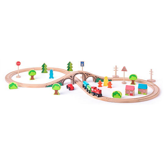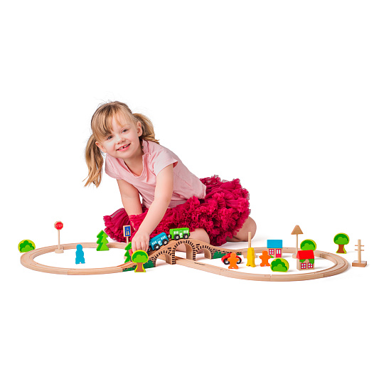 Otevřete kouzelný svět železnic v dřevěném kufříku! Po jeho rozložení vznikne na obou stranách jeho víka krajina s dráhou ve tvaru osmičky s vyfrézovanými kolejemi. Dřevěný vláček, dřevěná autíčka a kostky pro stavbu domečků tvoří dokonalou herní sadu v jedinečném designu od české výtvarnice. | Věk: 3+ | Rozměr rozloženého kufříku: 62 × 32 cm | Počet dílů: 55