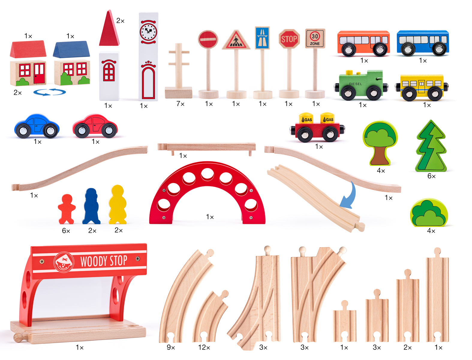 Set obsahuje 16 dílů různých kolejí k vláčkodráhám: 4 dlouhé rovné, 2 středně dlouhé rovné, 2 krátké rovné, 2 výhybky, 2 krátké zatáčky, 2 dlouhé zatáčky a 2 speciální spojovací koleje se stejnými spojovacími prvky (čudlík - čudlík, dírka - dírka). Koleje jsou vyrobeny z kvalitního bukového dřeva.