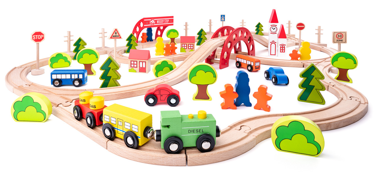Vláčkodráha s příslušenstvím navrženým českým designérem obsahuje 90 dílů. Dráhu lze postavit pokaždé jinak a jednotlivé díly je možné kombinovat i s ostatními vláčkodráhami dostupnými na našem trhu.