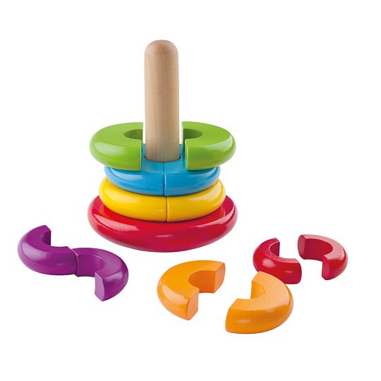 Skládanka s kroužky, ze které lze postavit pyramidu, si oblíbí každé dítě. Pyramida s barevnými kroužky pomáhá v rozvoji jemné motoriky a poznávání barviček. Velikost 28 cm. Vhodné od 12 měsíců.