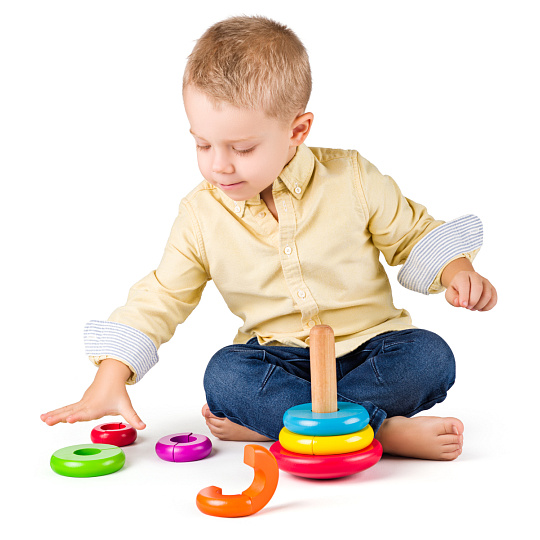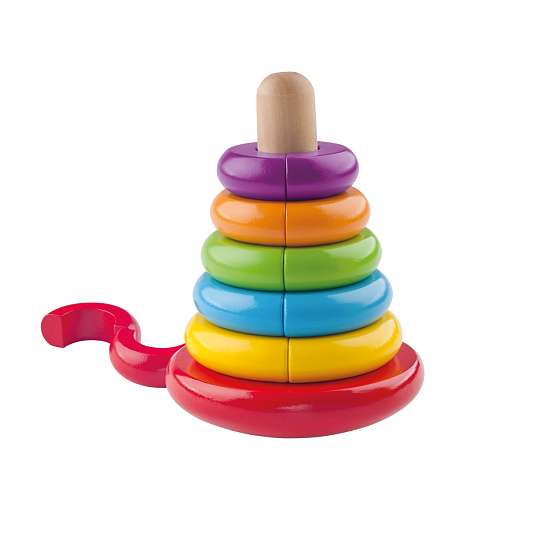 Skládanka s kroužky, ze které lze postavit pyramidu, si oblíbí každé dítě. Pyramida s barevnými kroužky pomáhá v rozvoji jemné motoriky a poznávání barviček. Velikost 28 cm. Vhodné od 12 měsíců.