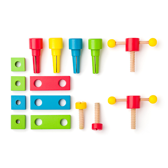 Montážní stavebnice "Engeneer" nabízí dětem konstrukční hru s nekonečným množstvím variant různých staveb od strojů a dopravních prostředků přes domečky , jeřáby až po létající talíře, mosty, věže atd. Obsahuje obrovské množství vysoce kvalitních dřevěných dílů ( dřevěné destičky v různých tvarech, matice, šrouby, kolečka, podložky, šroubovák a montážní klíč, atd...), se kterými se snadno pracuje a které po zatažení šroubů vytvoří pevnou konstrukci. Věk: 3+. Velikost dílku se 6ti dírkami: 22 cm, velikost obdélníkové destičky: 18,5 x 11 cm. Počet ks: 340