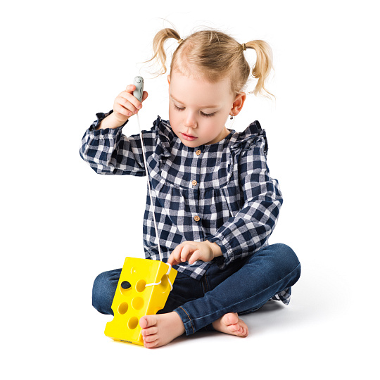 Motorická hra pro nejmenší . Dítě provléká myšku uchycenou na šňůrce děravým sýrem a tím cíleně cvičí jemnou motoriku. | Věk: 3+| Rozměr: 13,5 x 8,5 x 5 cm... více