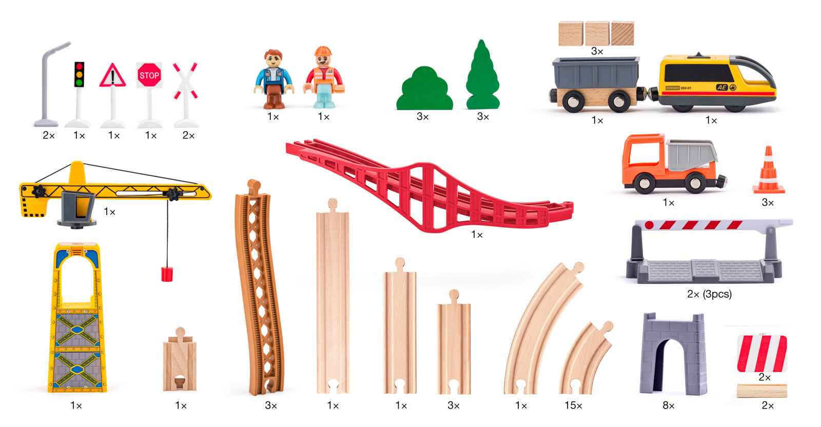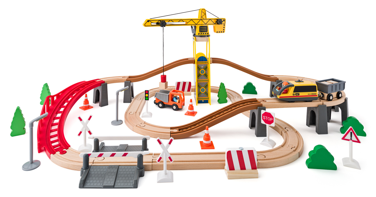 Víceúrovňová vláčkodráha s lanovým mostem a kombinací kolejí dřevo/plast. Sestava obsahuje elektrickou mašinku, plastové autíčko, vlakovou zastávku, 2 figurky a další příslušenství. Dráhu lze postavit pokaždé jinak a jednotlivé díly je možné kombinovat i s ostatními vláčkodráhami dostupnými na našem trhu. | Věk: 3+| Rozměr rozložené dráhy: š 90cm/v. 12cm/ hl.56cm, délka tratě: 260cm