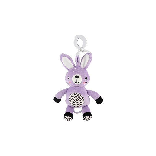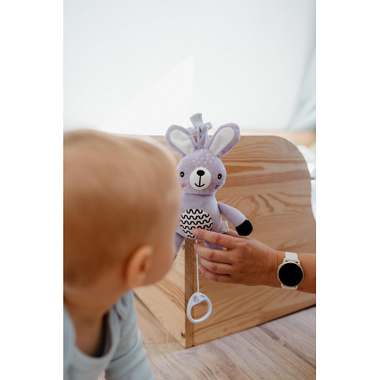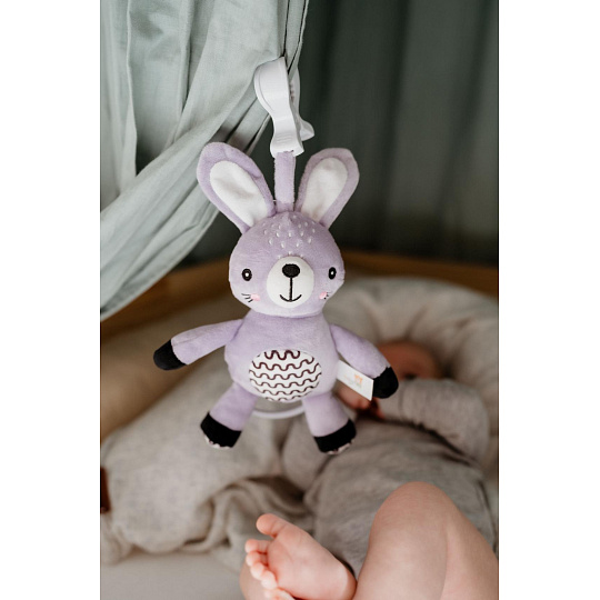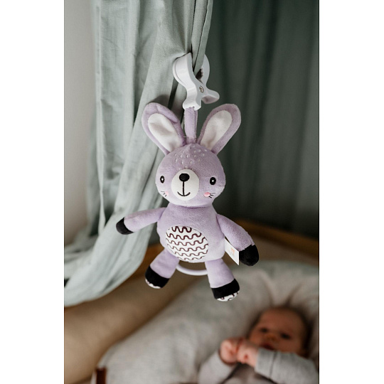 Roztomilý plyšový zajíček s natahovacím hracím strojkem je ideálním společníkem pro miminka již od narození. Stačí zatáhnout a hračka začne přehrávat uklidňující melodii, která pomáhá děťátku zklidnit se a snadněji usnout. Díky praktickému závěsnému klipu lze hračku snadno připevnit na kočárek, postýlku, autosedačku nebo hrazdičku. Miminko tak bude mít svého hebkého kamaráda vždy u sebe – doma i na cestách. Zajíček je vyroben z měkkého a příjemného plyše, který miminka přímo vybízí k mazlení. Jemné pastelové provedení a kontrastní vzory podporují vizuální vnímání malých dětí, má také jemně šustící uši. Hračka je certifikována v ČR, takže splňuje přísné bezpečnostní normy pro děti od 0 měsíců.
