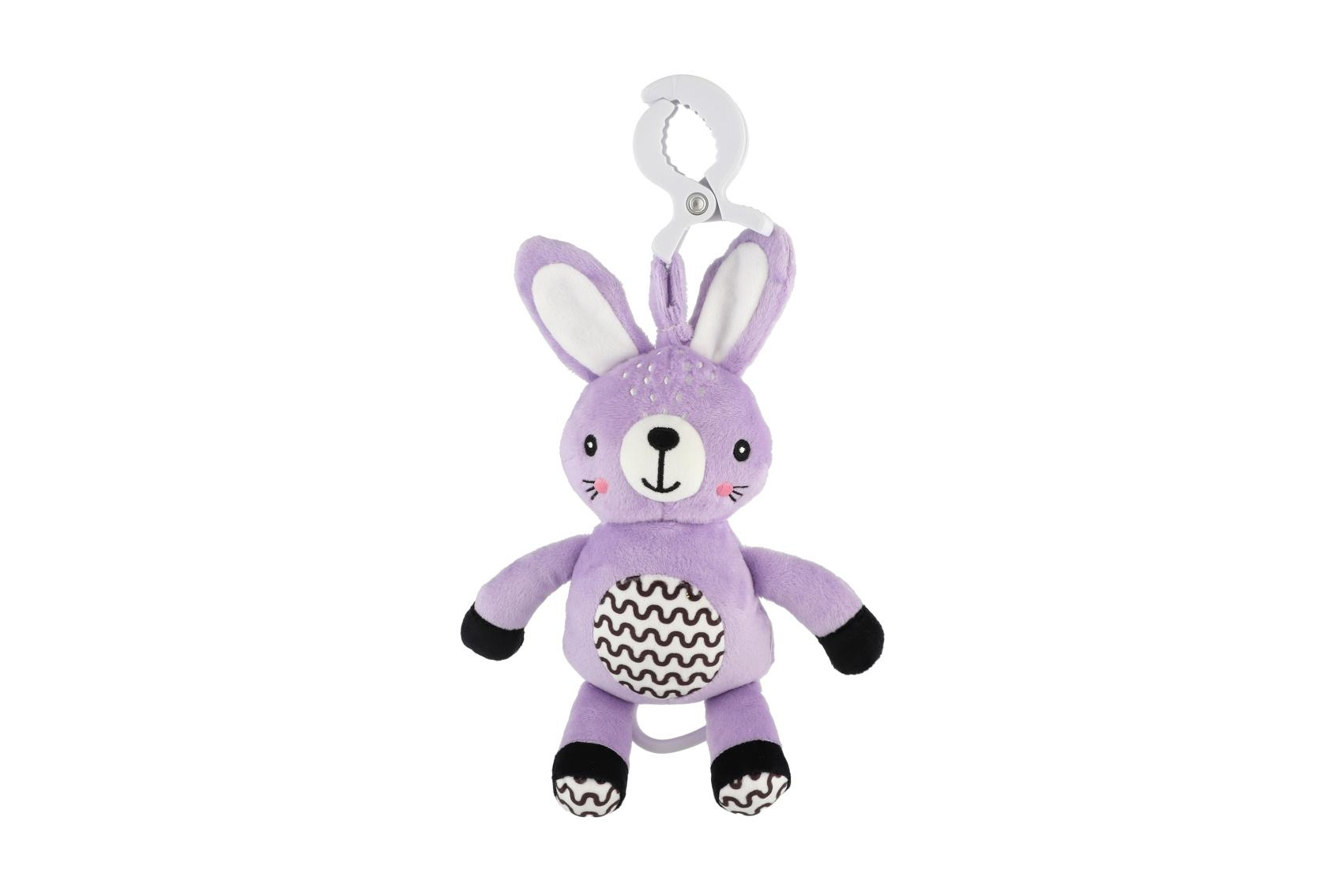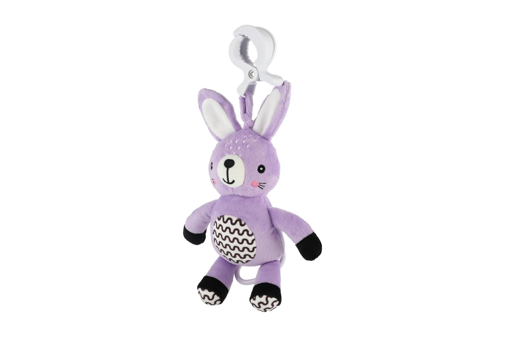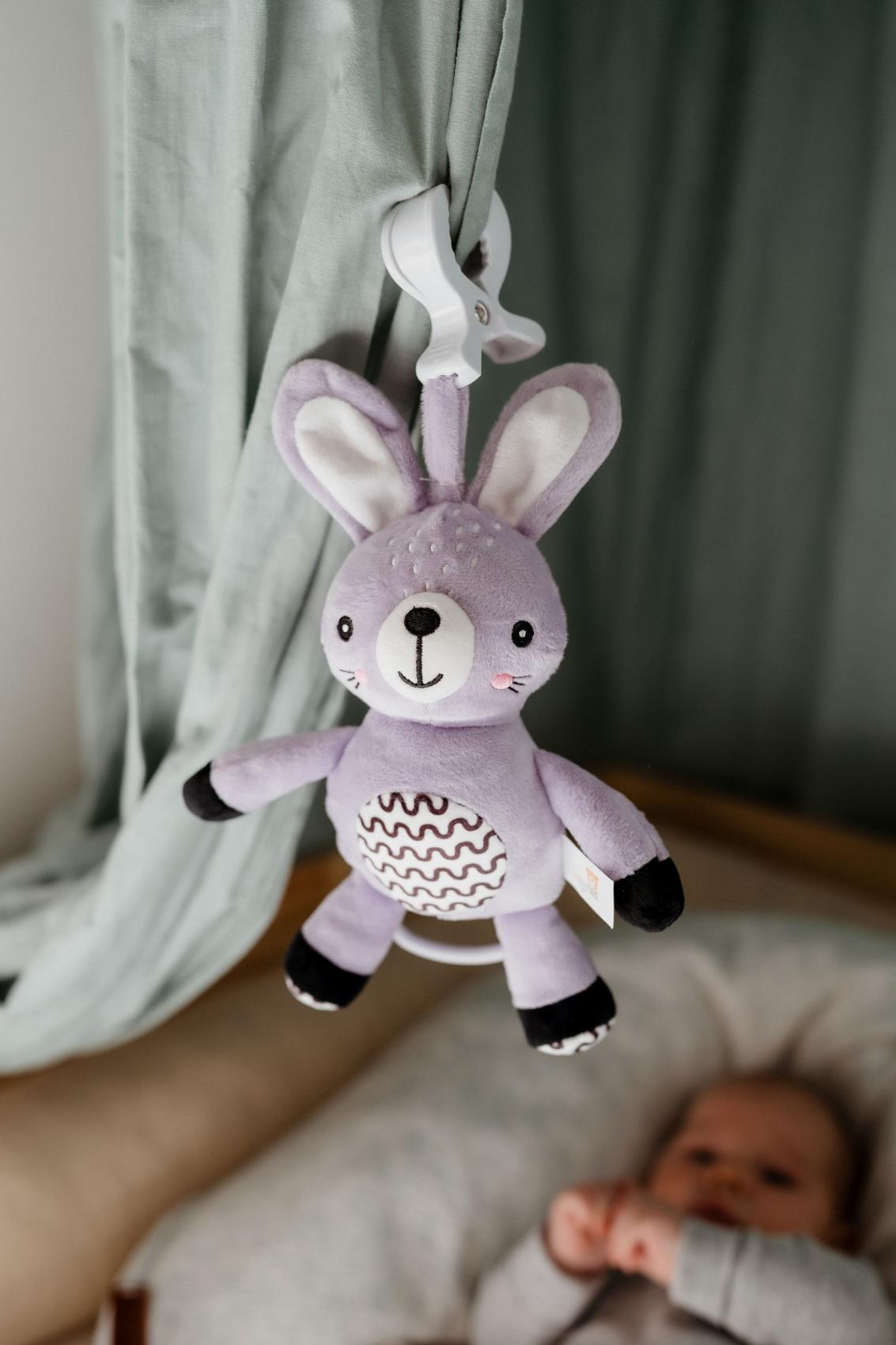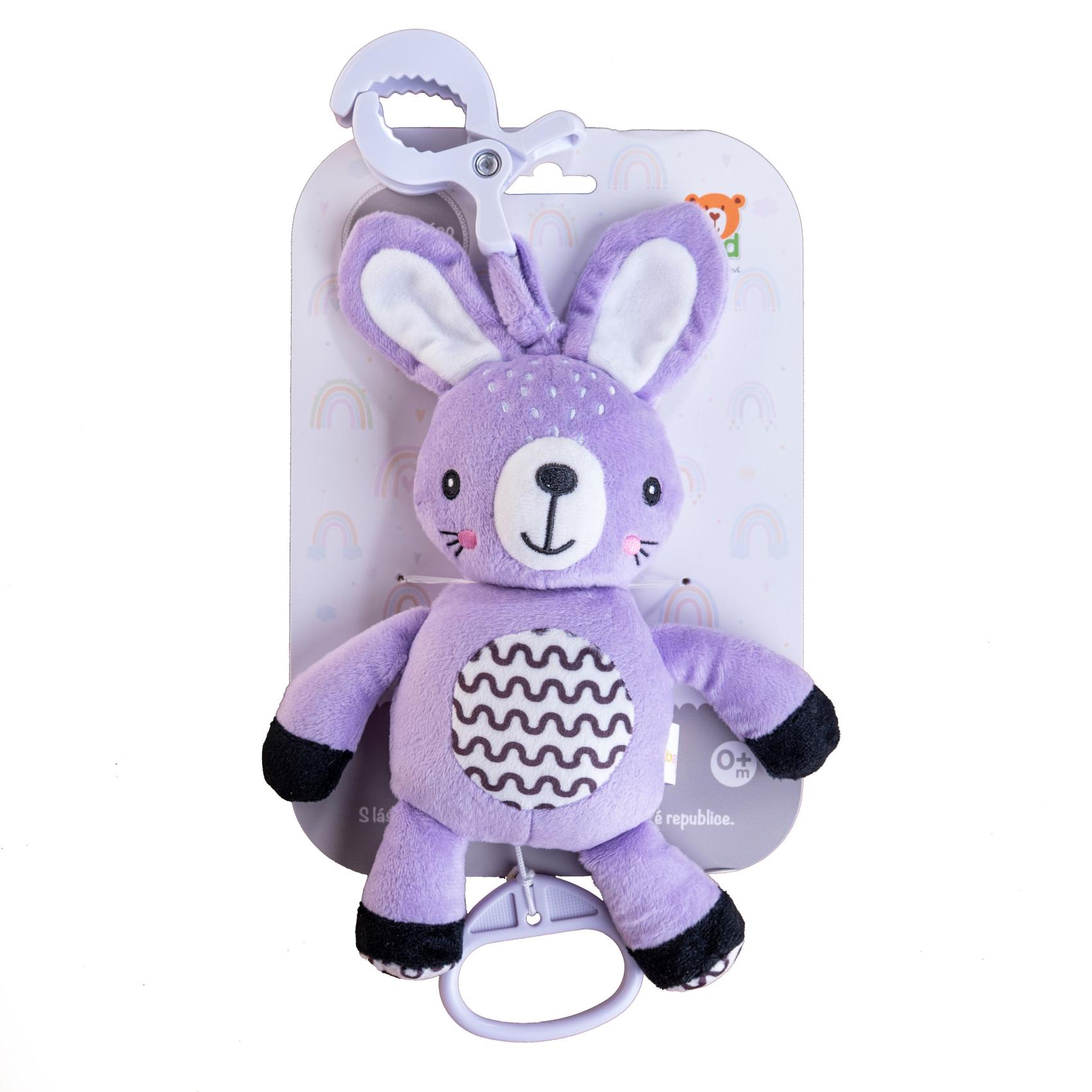 Roztomilý plyšový zajíček s natahovacím hracím strojkem je ideálním společníkem pro miminka již od narození. Stačí zatáhnout a hračka začne přehrávat uklidňující melodii, která pomáhá děťátku zklidnit se a snadněji usnout. Díky praktickému závěsnému klipu lze hračku snadno připevnit na kočárek, postýlku, autosedačku nebo hrazdičku. Miminko tak bude mít svého hebkého kamaráda vždy u sebe – doma i na cestách. Zajíček je vyroben z měkkého a příjemného plyše, který miminka přímo vybízí k mazlení. Jemné pastelové provedení a kontrastní vzory podporují vizuální vnímání malých dětí, má také jemně šustící uši. Hračka je certifikována v ČR, takže splňuje přísné bezpečnostní normy pro děti od 0 měsíců.