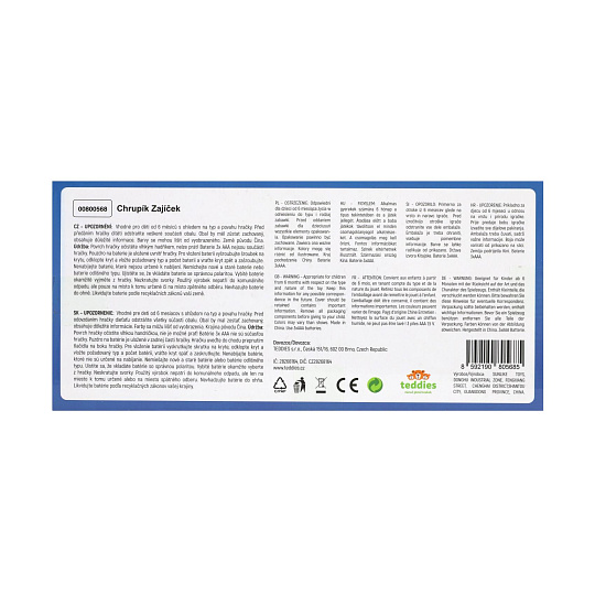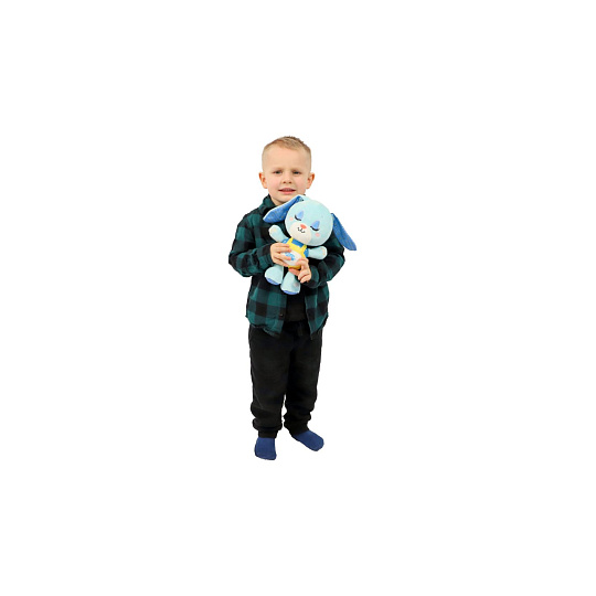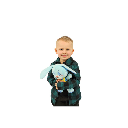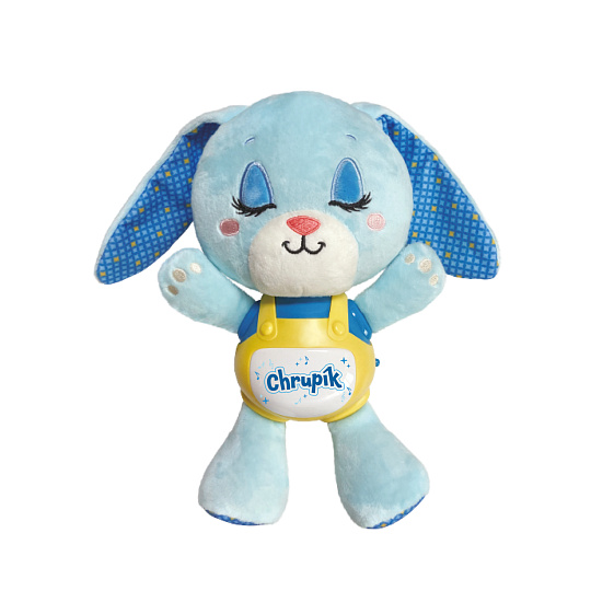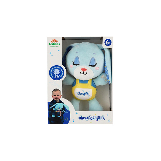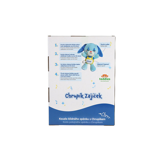 Zajíček Chrupík – kouzelný usínáček se světlem a zvuky pro klidné večery. Usínání bude odteď pro děti kouzelným zážitkem. Roztomilý Zajíček Chrupík kombinuje mazlivého plyšového kamaráda s uklidňujícím světlem a zvuky. Je ideálním společníkem pro večerní rituály a první samostatné usínání. Zajiček je vyroben z hebkého plyše a má plastový panel se světelnými a zvukovými efekty. Po stisknutí tlačítka zahraje jemnou melodii, která uklidní dítě a podbarví příjemnou atmosféru tlumeným světýlkem. Díky napájení na baterie lze hračku snadno používat kdekoliv – v postýlce, kočárku i na cestách. Rozměry balení 22 x 30 x 11 cm Vhodné pro děti od 6 měsíců
