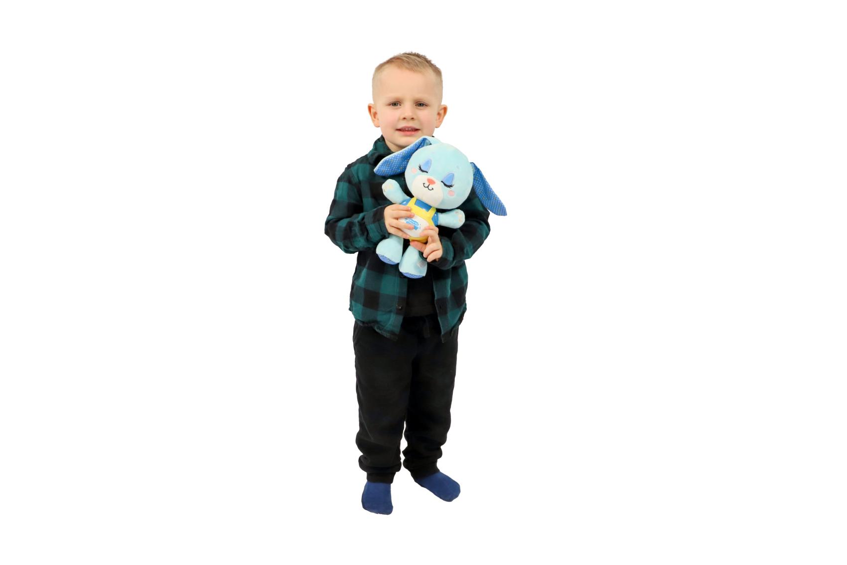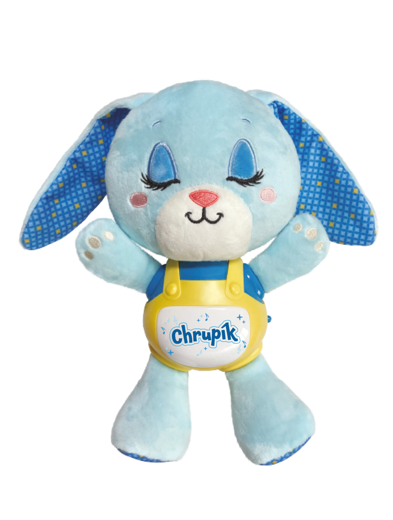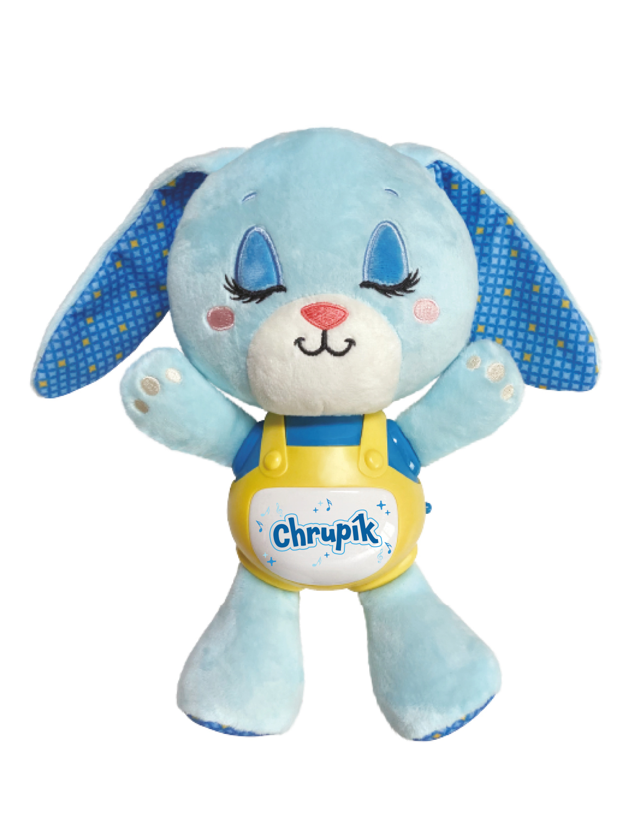 Zajíček Chrupík – kouzelný usínáček se světlem a zvuky pro klidné večery. Usínání bude odteď pro děti kouzelným zážitkem. Roztomilý Zajíček Chrupík kombinuje mazlivého plyšového kamaráda s uklidňujícím světlem a zvuky. Je ideálním společníkem pro večerní rituály a první samostatné usínání. Zajiček je vyroben z hebkého plyše a má plastový panel se světelnými a zvukovými efekty. Po stisknutí tlačítka zahraje jemnou melodii, která uklidní dítě a podbarví příjemnou atmosféru tlumeným světýlkem. Díky napájení na baterie lze hračku snadno používat kdekoliv – v postýlce, kočárku i na cestách. Rozměry balení 22 x 30 x 11 cm Vhodné pro děti od 6 měsíců