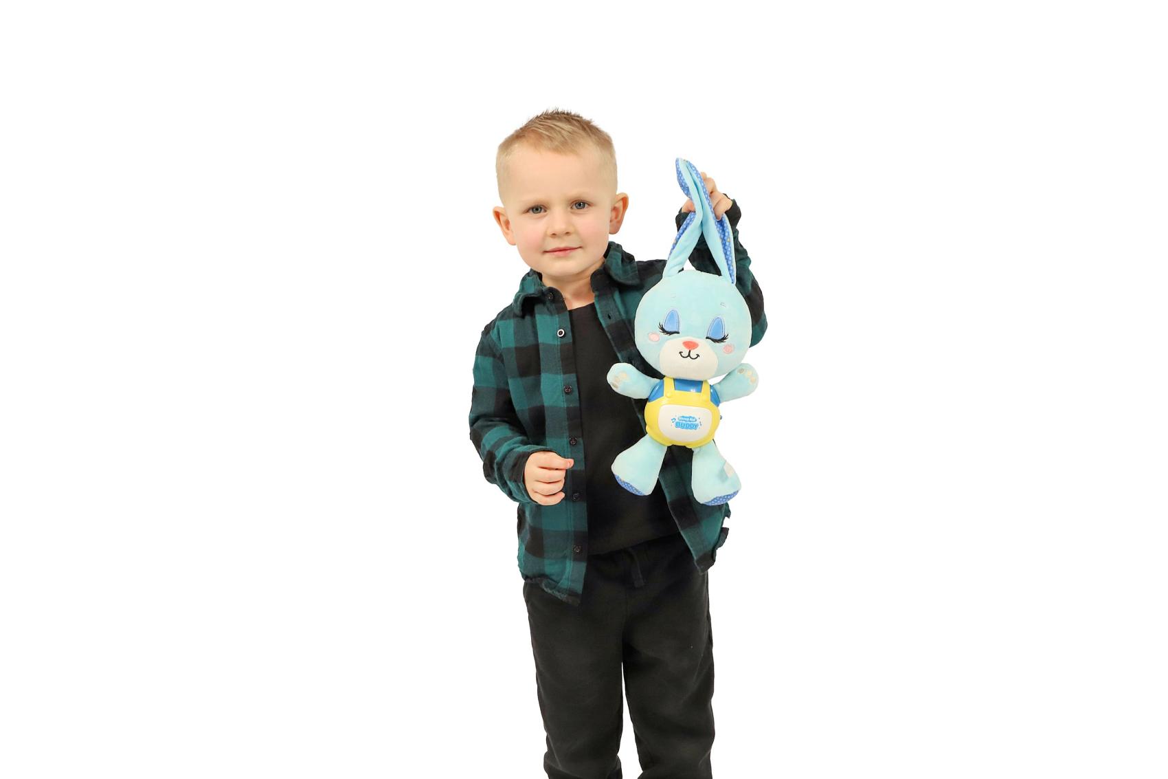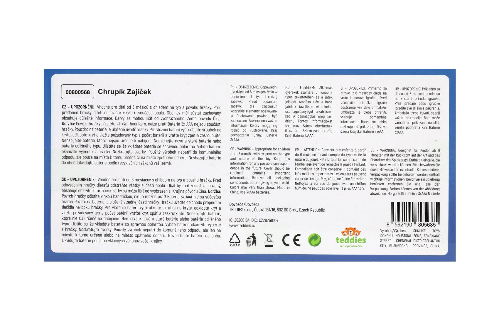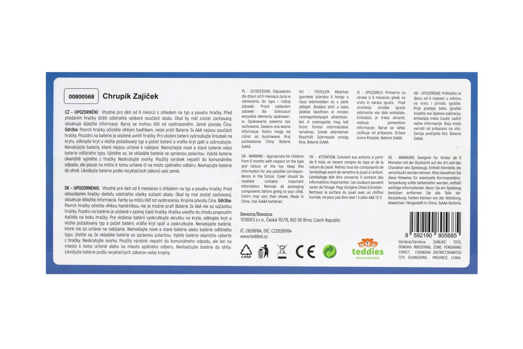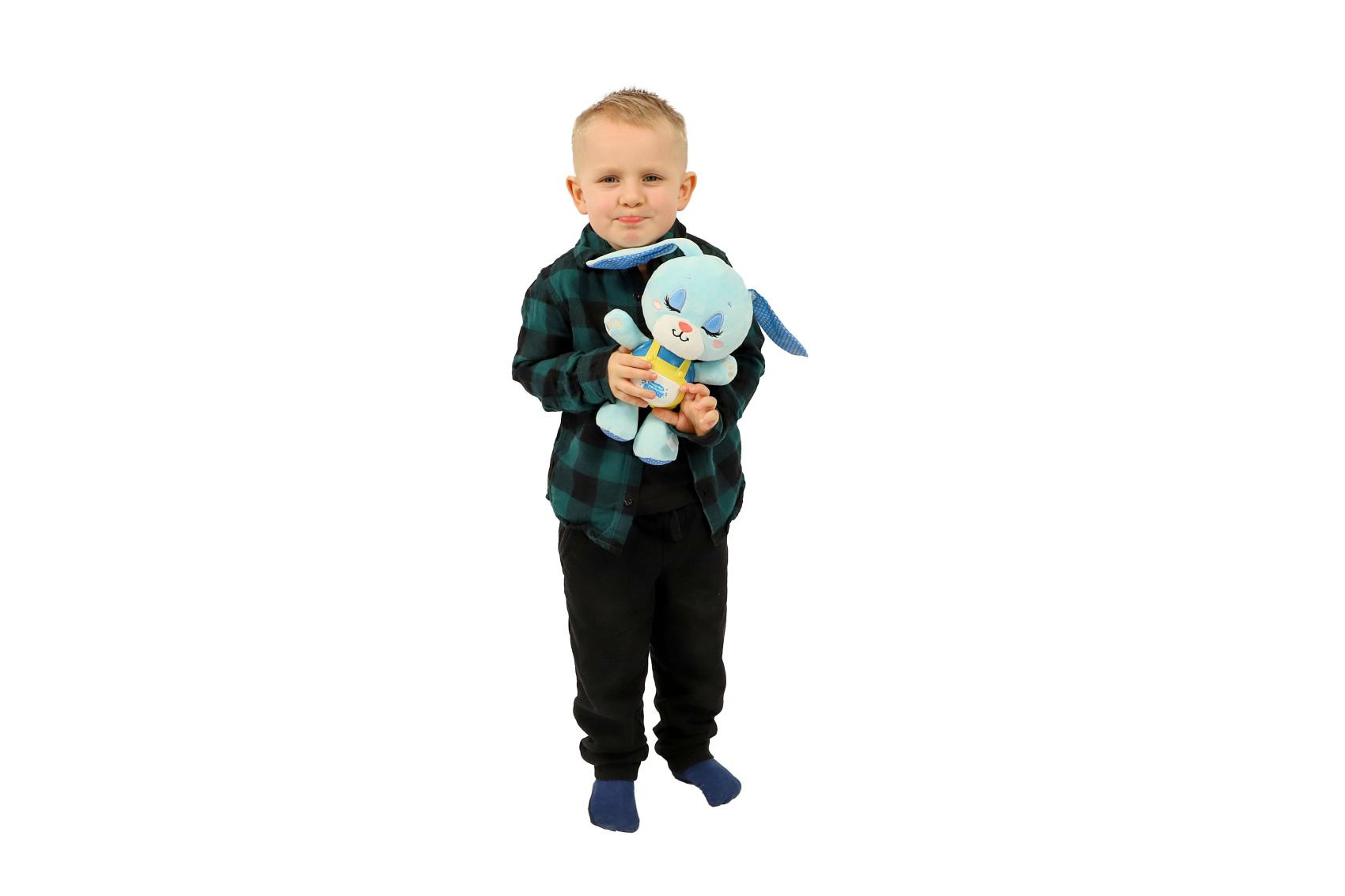 Zajíček Chrupík – kouzelný usínáček se světlem a zvuky pro klidné večery. Usínání bude odteď pro děti kouzelným zážitkem. Roztomilý Zajíček Chrupík kombinuje mazlivého plyšového kamaráda s uklidňujícím světlem a zvuky. Je ideálním společníkem pro večerní rituály a první samostatné usínání. Zajiček je vyroben z hebkého plyše a má plastový panel se světelnými a zvukovými efekty. Po stisknutí tlačítka zahraje jemnou melodii, která uklidní dítě a podbarví příjemnou atmosféru tlumeným světýlkem. Díky napájení na baterie lze hračku snadno používat kdekoliv – v postýlce, kočárku i na cestách. Rozměry balení 22 x 30 x 11 cm Vhodné pro děti od 6 měsíců