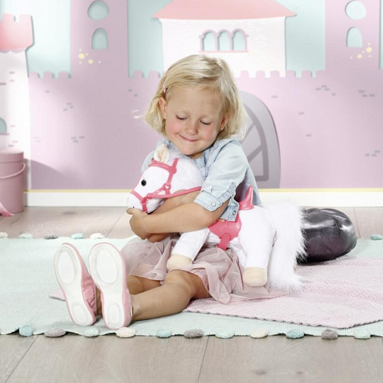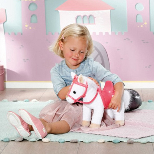 Bílý poníček má královskou uzdu se třpytivou korunkou. Za ní má poník pozorně nastražená legrační ouška. Po stisknutí pravého ouška poník zařehtá nebo zafuní. Po stisknutí levého ouška uslyšíte klapot kopyt. Panenka Baby Annabell Little je zamilovaná do svého zvířecího miláčka a často mu dává pusinku na čumáček. Poník odpovídá zvukem polibku. Malá princezna při vyjížďce sedí pohodlně v sedle. Perfektně formované jezdecké sedlo zajistí, že v něm má panenka při jízdě potřebnou stabilitu.