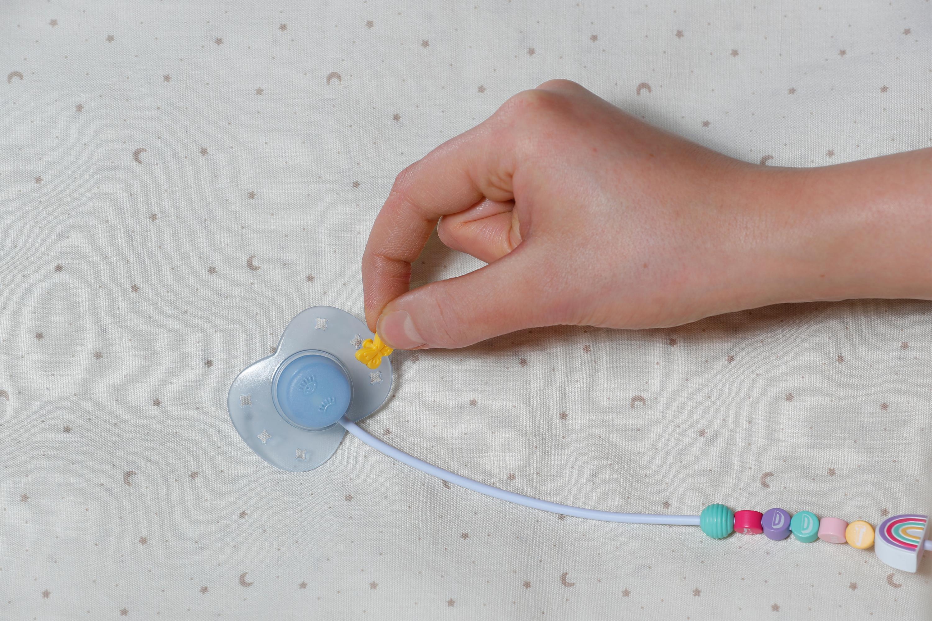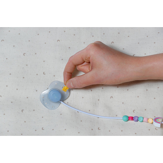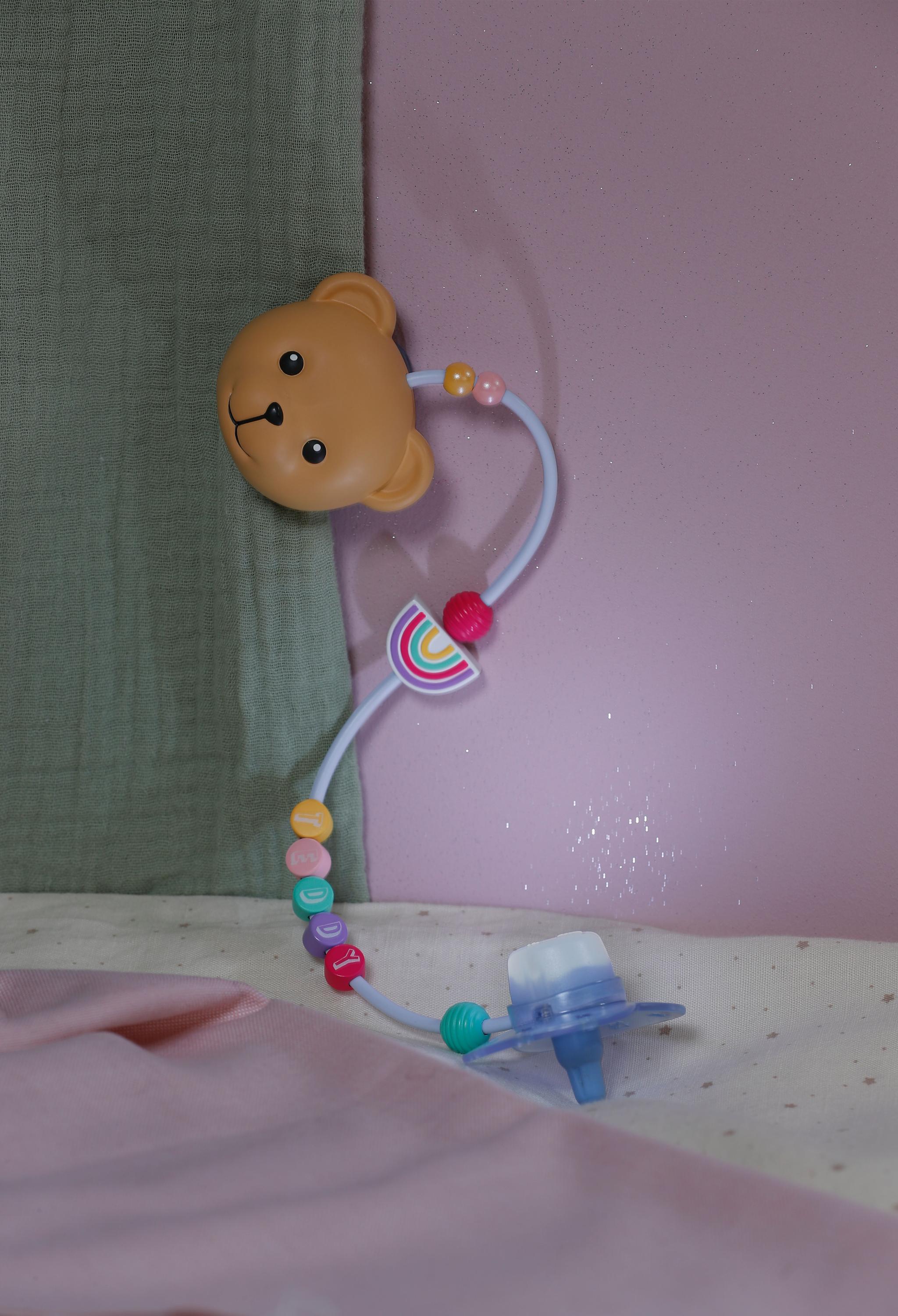 Interaktivní kouzelný dudlík je perfektní doplňek pro panenky o velikosti 43 cm. Zaujme roztomilým designem. Dudlík má praktický klip s roztomilou hlavičkou medvídka a barevnými korálky. Po stisknutí dudlíku zazní příjemná ukolébavka a rozsvítí se jemné světlo. Ideální pro klidné uspávání panenky.