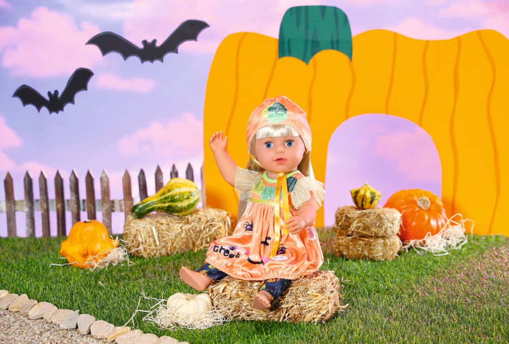 BABY born si oblékla svůj krásný halloweenský kostým, aby mohla jít spolu se svými rodiči koledovat a přinést si domů spoustu sladkostí. V balónových šatičkách a oranžové čepičce vypadá jako dýně. Ozdobné lístečky na čepičce a na šatičkách jsou moc roztomilé. Na tmavě šedé legíny se vplížilo několik pavoučků a černých koček. Samozřejmě jsou na nich také obrázky dýní. Protože co by to bylo za Halloween bez dýní?
