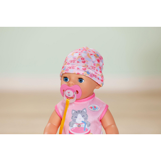 Když dostane svůj dudlík, který je připevněný k jejím dupačkám s roztomilým kočičím motivem, kouzelně otevírá a zavírá oči. Otočením dudlíku doleva zavře oči, otočením doprava je zase otevře. Když ji položíte do postýlky, zavřou se oči i bez dudlíku, jako by opravdu spala.