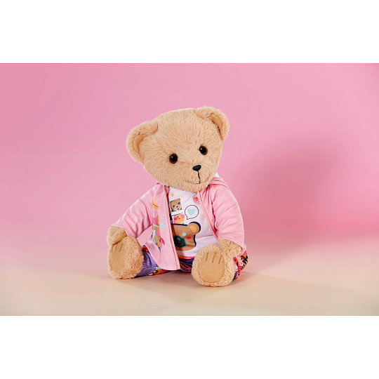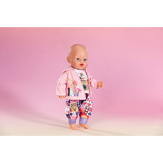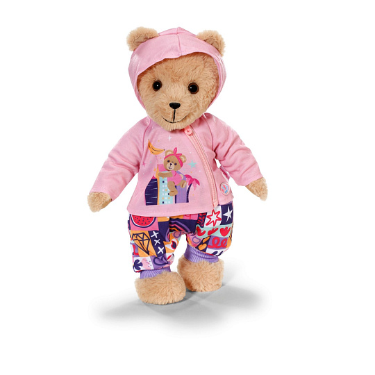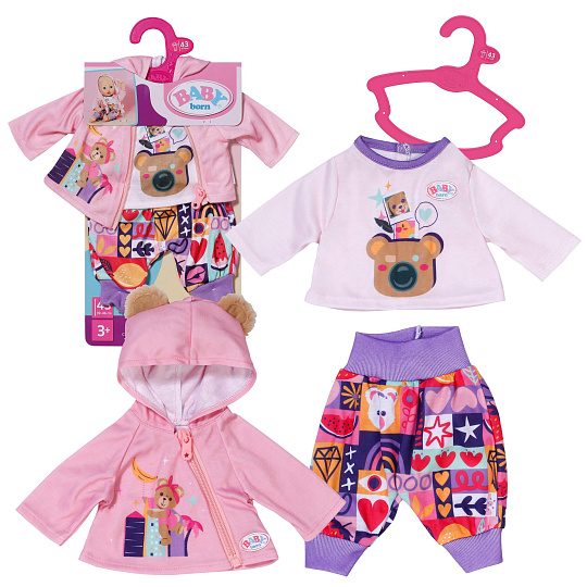Roztomilý obleček pro miminko se skládá ze tří částí: barevných kalhot s fialovými lemy a patchworkovým vzorem ve veselých barvách, světle fialového trička s dlouhým rukávem ozdobeného obrázkem medvídka a roztomilé růžové bundy s kapucí, která má roztomilá hebká medvědí ouška. Díky tomuto outfitu je BABY born vždy krásně v teple.